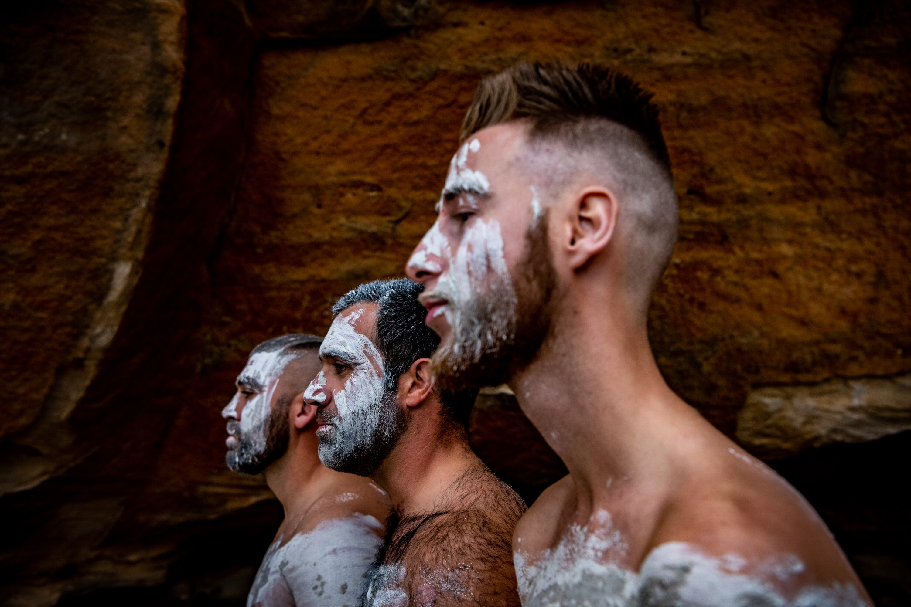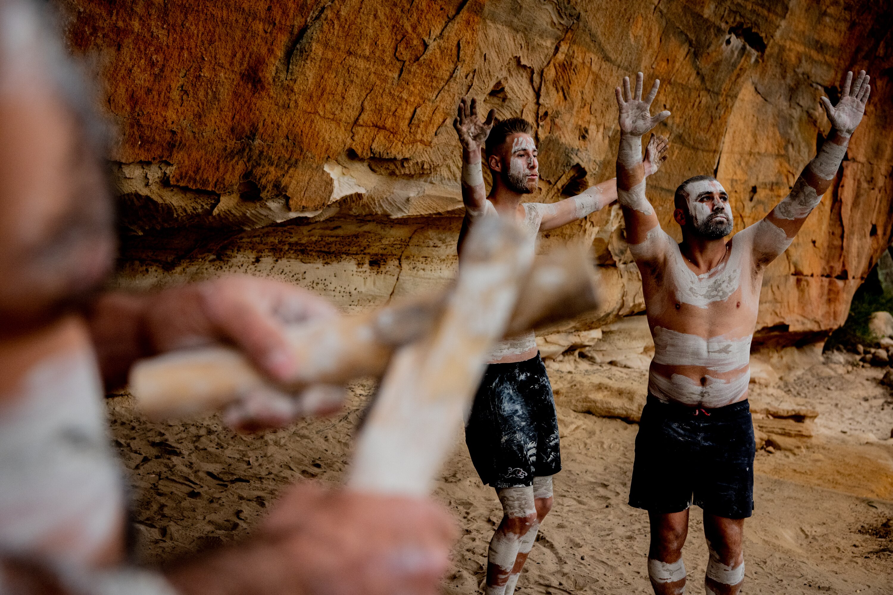In the Pilliga Forest, three men are dancing the totem animals of the Gomeroi people, as Ms Tighe watches on.