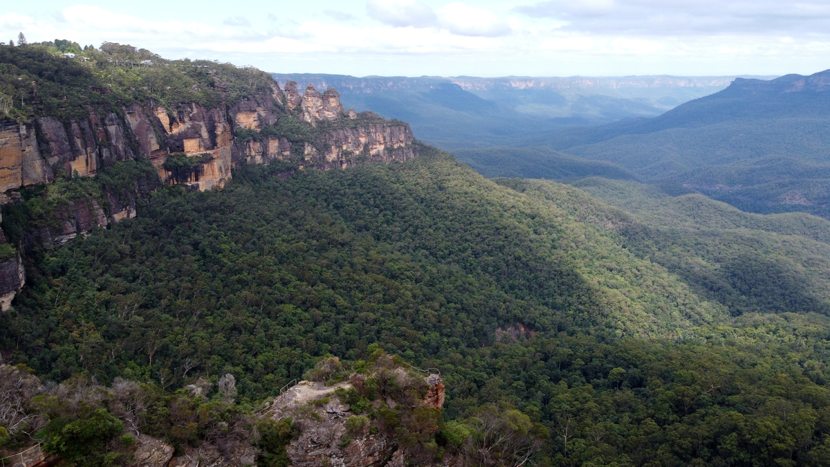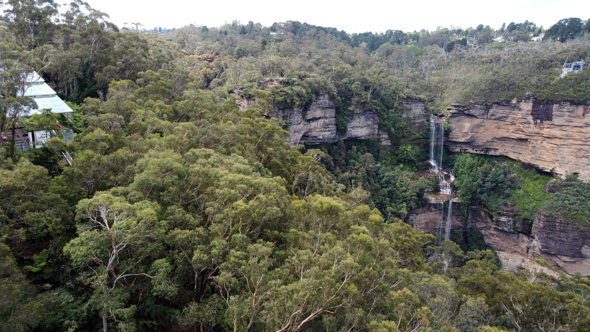 Sparse handfuls of people stand at railings to gaze at plunging rocks and shimmering waterfalls amid the verdant vegetation of Australia's Blue Mountains, presenting a stark contrast with the throngs usually drawn to the attraction every year.