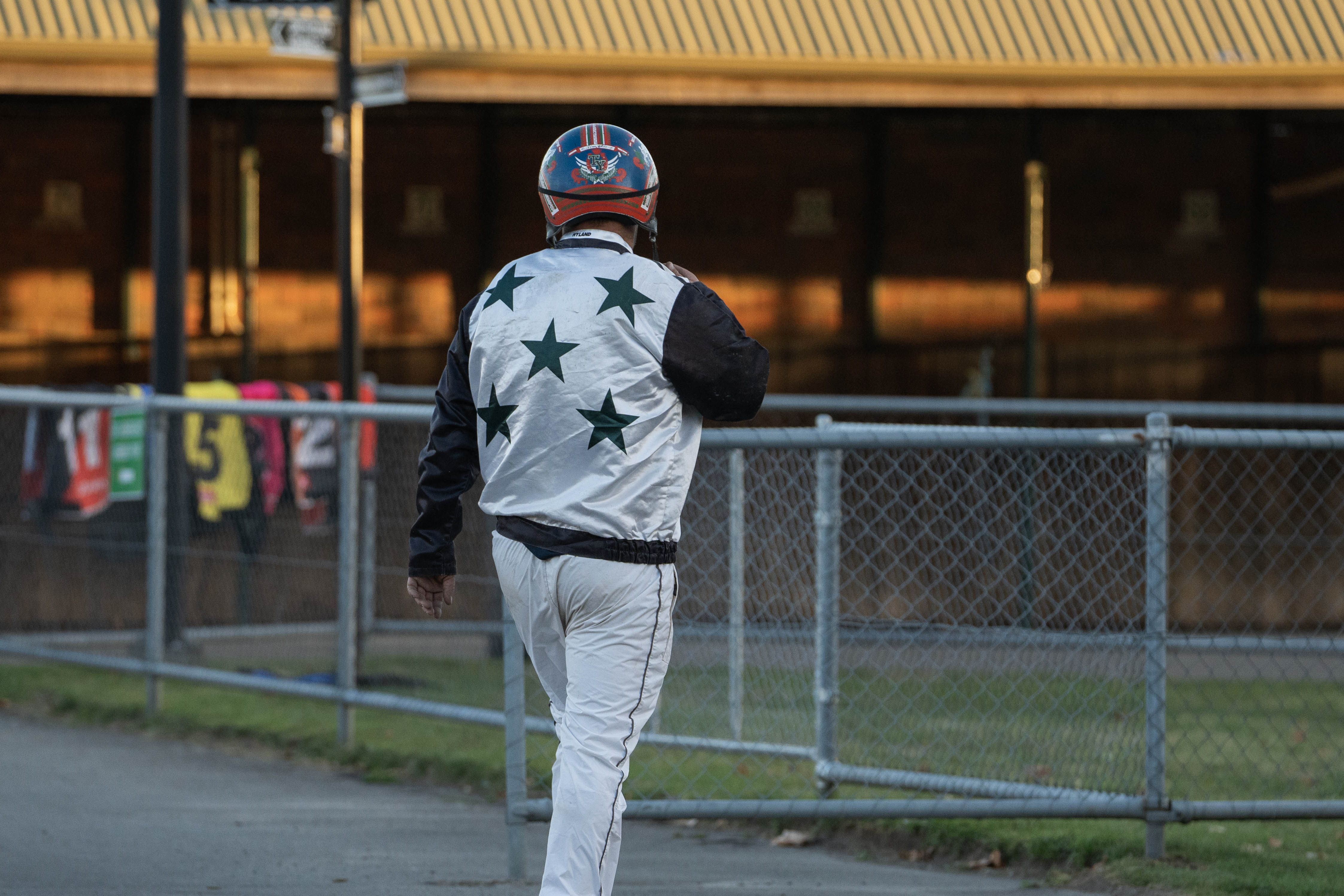 Drivers parade in their coloured silks, as the races are called in a steady monotone.
