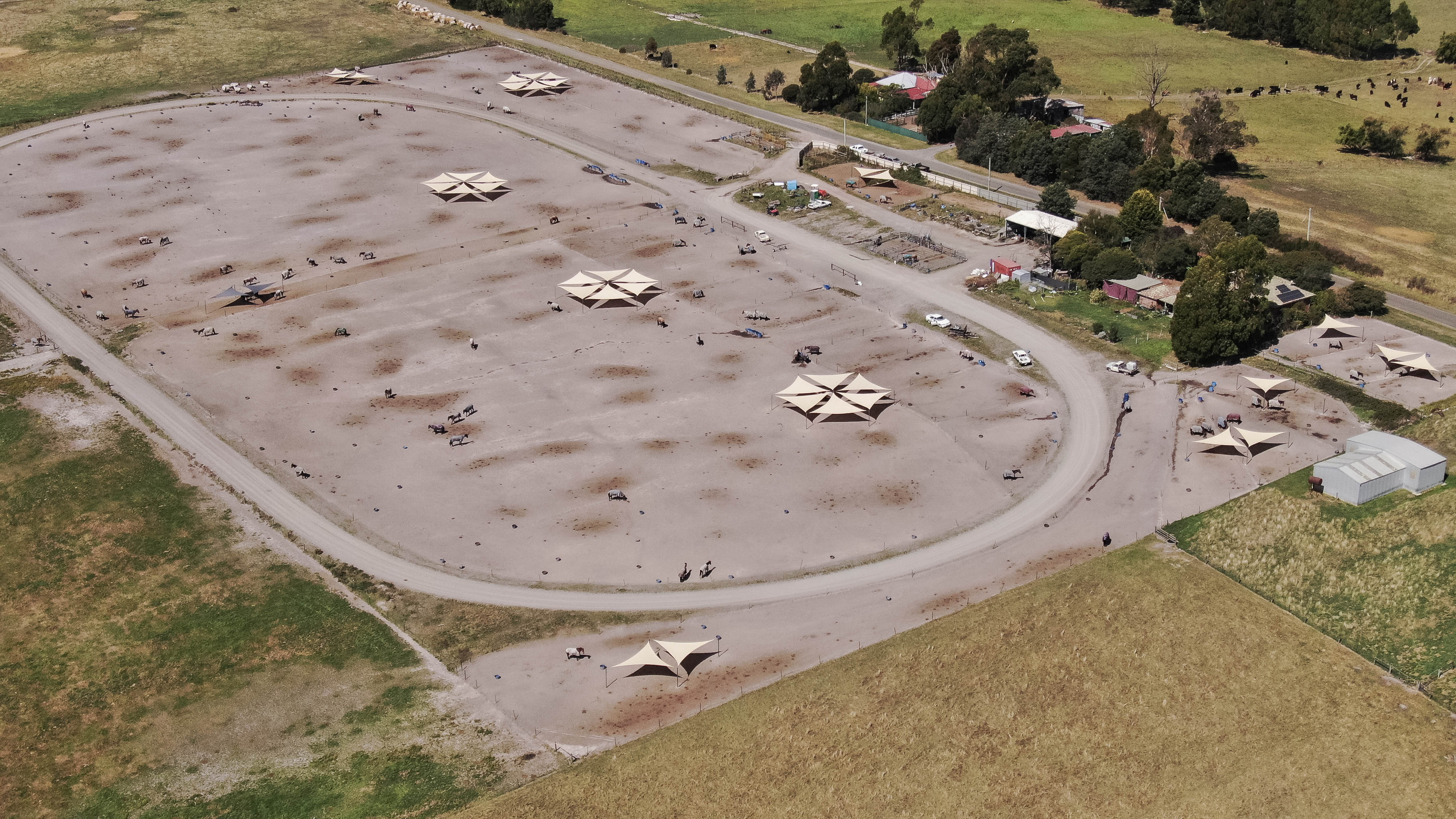 From the fence line, dozens of horses can be seen covered in canvas rugs, grazing in dusty paddocks.