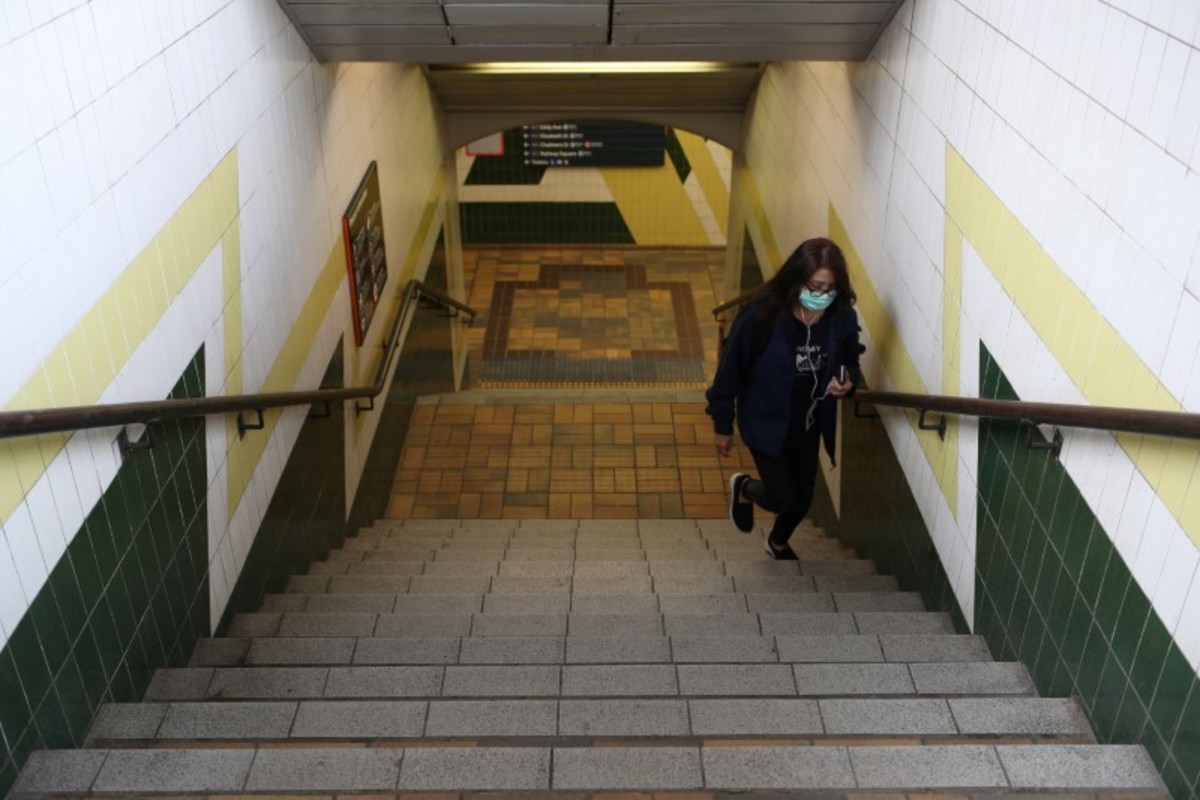 A woman wearing a face mask climbs the stairs at a train station after New South Wales began shutting down non-essential businesses and moving toward harsh penalties to enforce self-isolation as the spread of coronavirus disease (COVID-19) reached a critical stage in Sydney, Australia, March 24, 2020. REUTERS/Loren Elliott