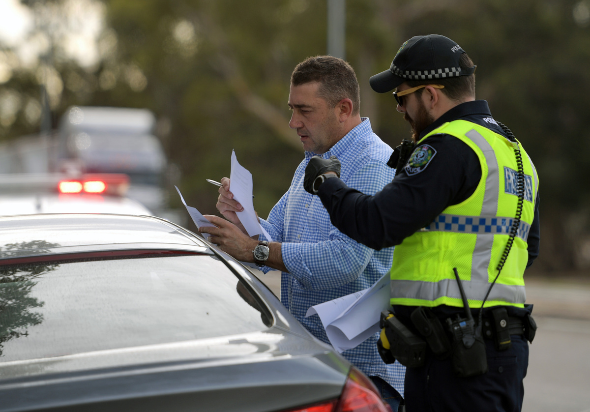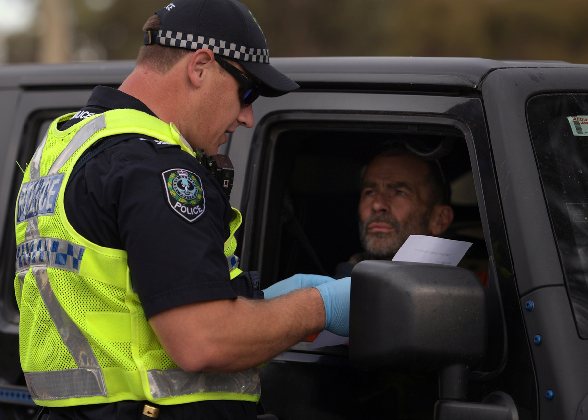 Motorist fills out paperwork for police as he crosses back into South Australia from Victoria during the coronavirus disease (COVID-19) outbreak, in Bordertown, Australia, March 24, 2020. REUTERS/Tracey Nearmy