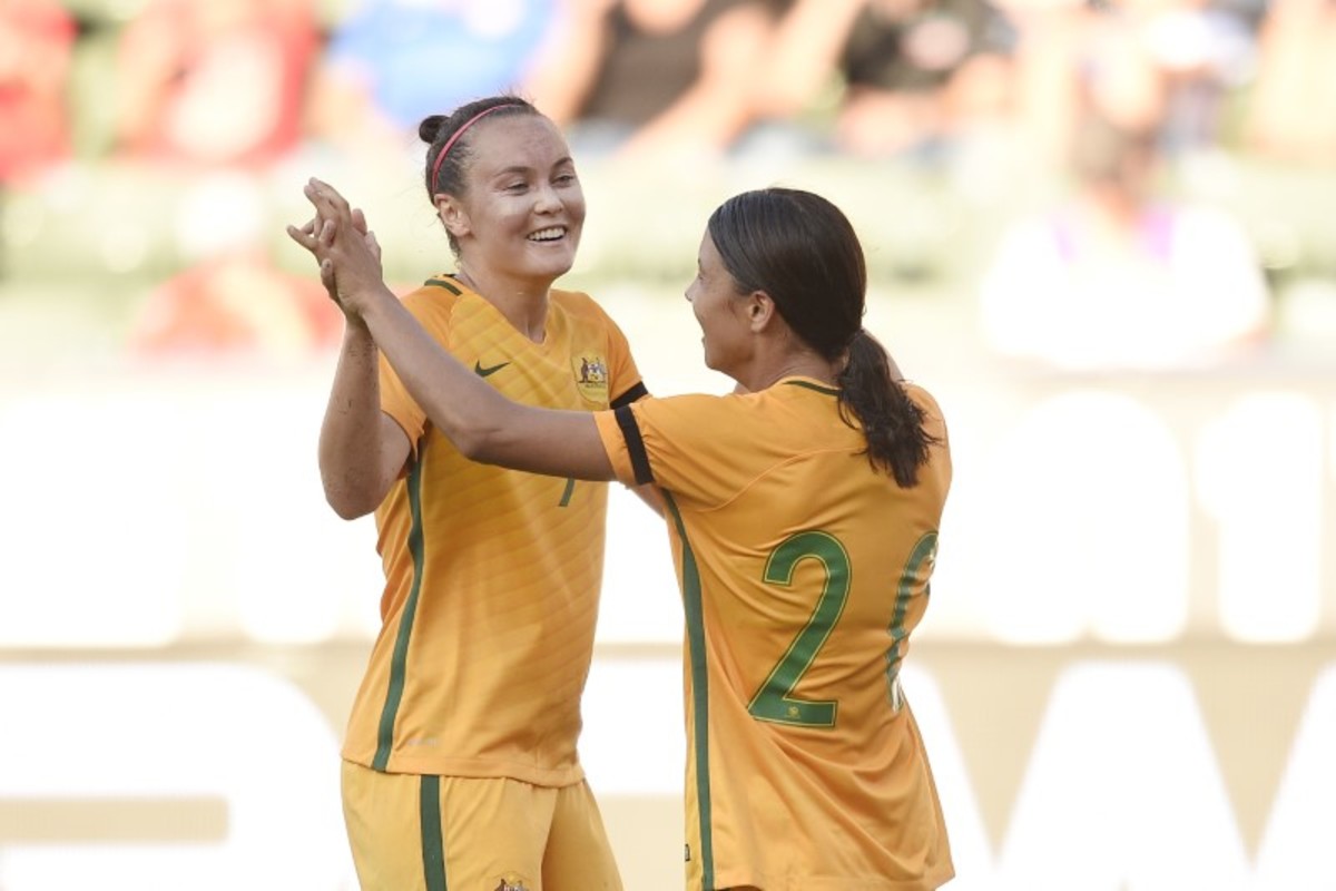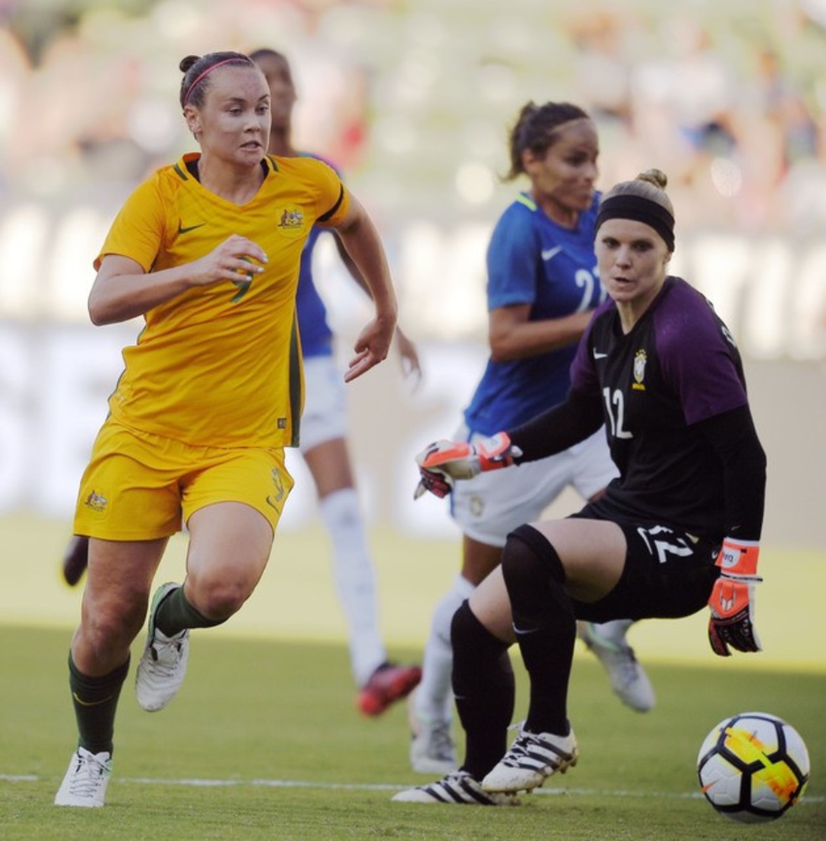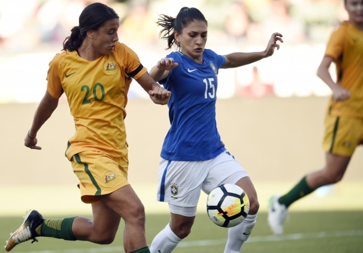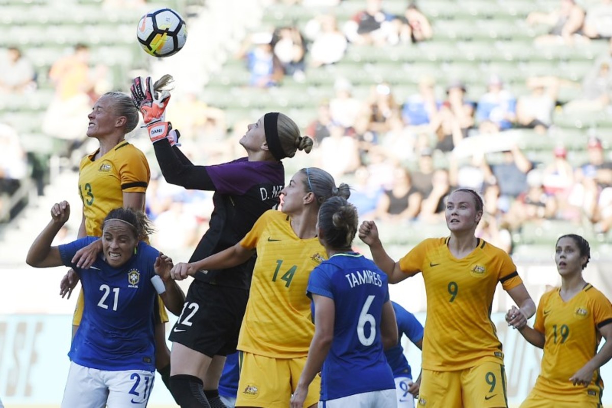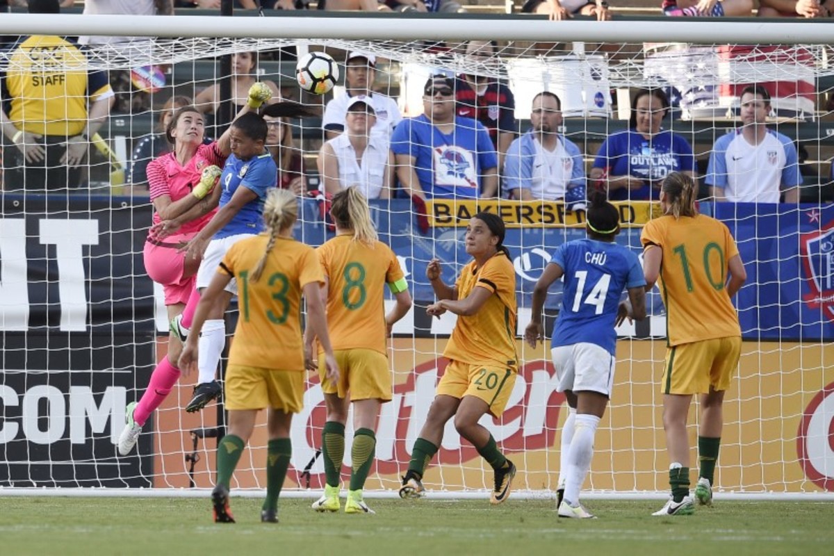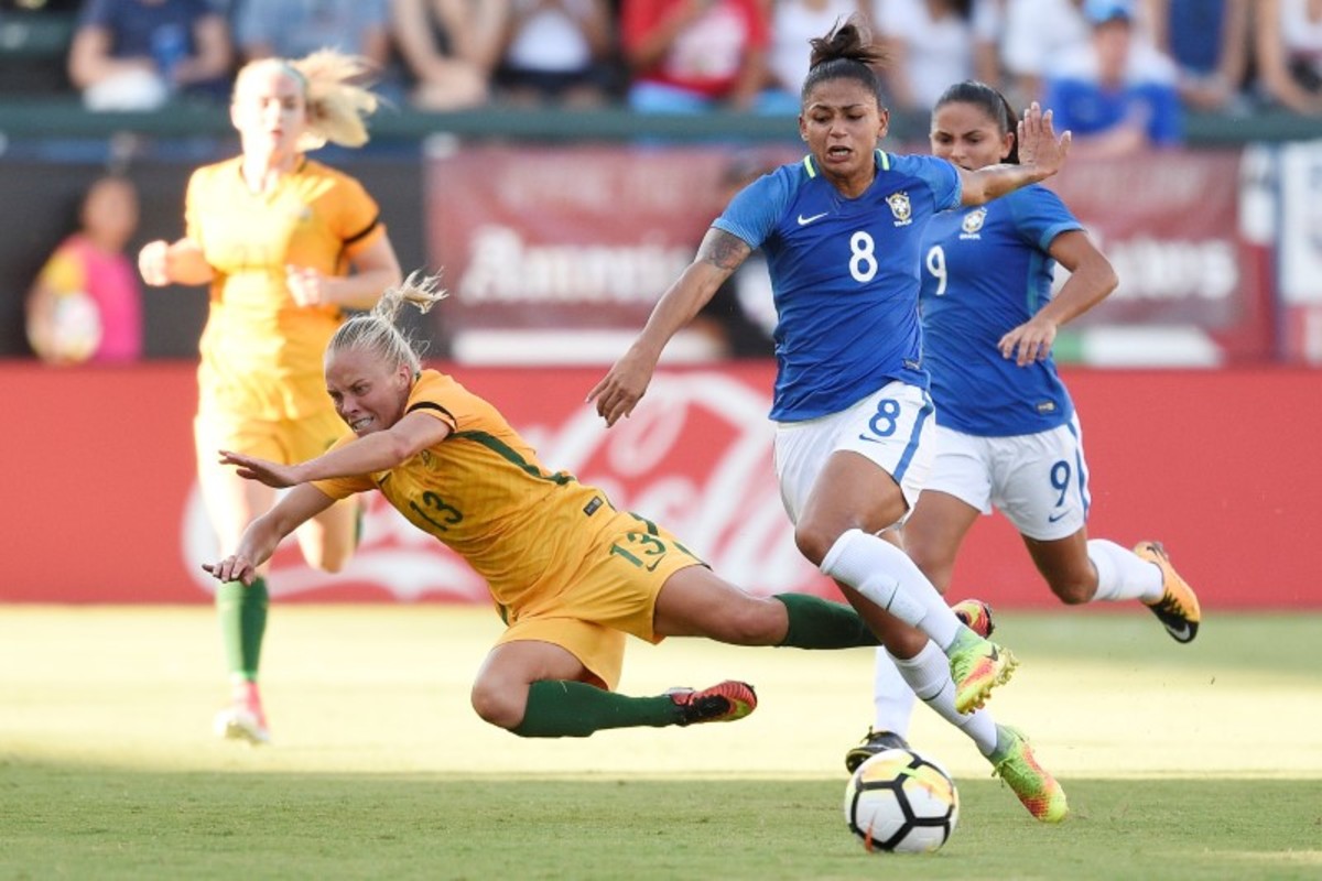Aug 3, 2017; Carson, CA, USA; Australia midfielder Caitlin Foord (9) and Brazil defender Bruna Benites (3) battle for the ball during the second half at StubHub Center. Australia won 6-1. Mandatory Credit: Kelvin Kuo-USA TODAY SportsAug 3, 2017; Carson, CA, USA; Australia forward Sam Kerr (20) celebrates with midfielder Caitlin Foord (9) after scoring a goal against Brazil during the second half at StubHub Center. Australia won 6-1. Mandatory Credit: Kelvin Kuo-USA TODAY SportsAug 3, 2017; Carson, CA, USA; Australia forward Sam Kerr (20) and Brazil defender Leticia (15) battle for the ball during the second half at StubHub Center. Australia won 6-1. Mandatory Credit: Kelvin Kuo-USA TODAY Sports