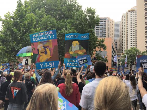 Fellow protestor Dannie, 24, turned up to the rally with her dog Bindy, carrying a sign reading "I'm a dog and I support same-sex marriage. It would affect me as much as it would affect you."