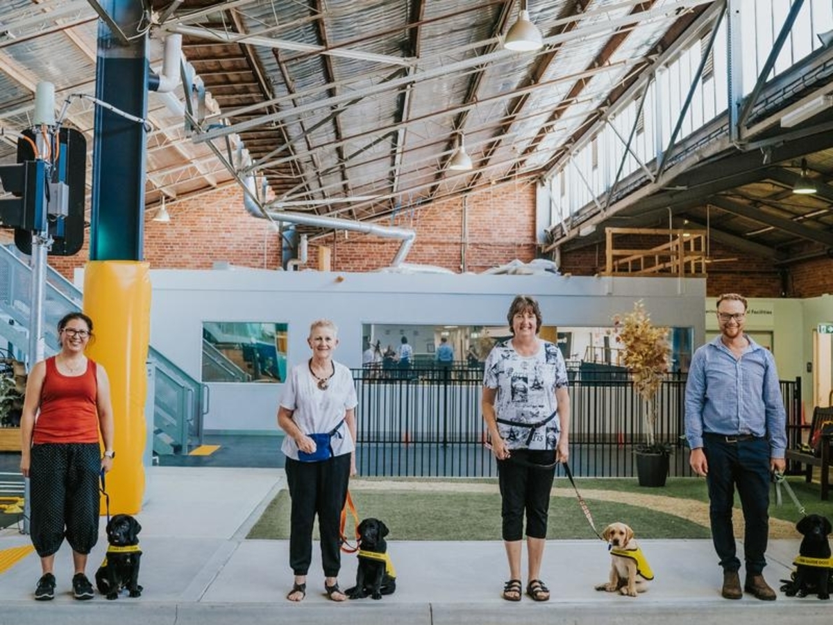 At Vision Australia's Seeing Eye Dogs site in Kensington, Rex, Harley, Bridget and Oscar came together for the first time on Wednesday to be put through their puppy paces.