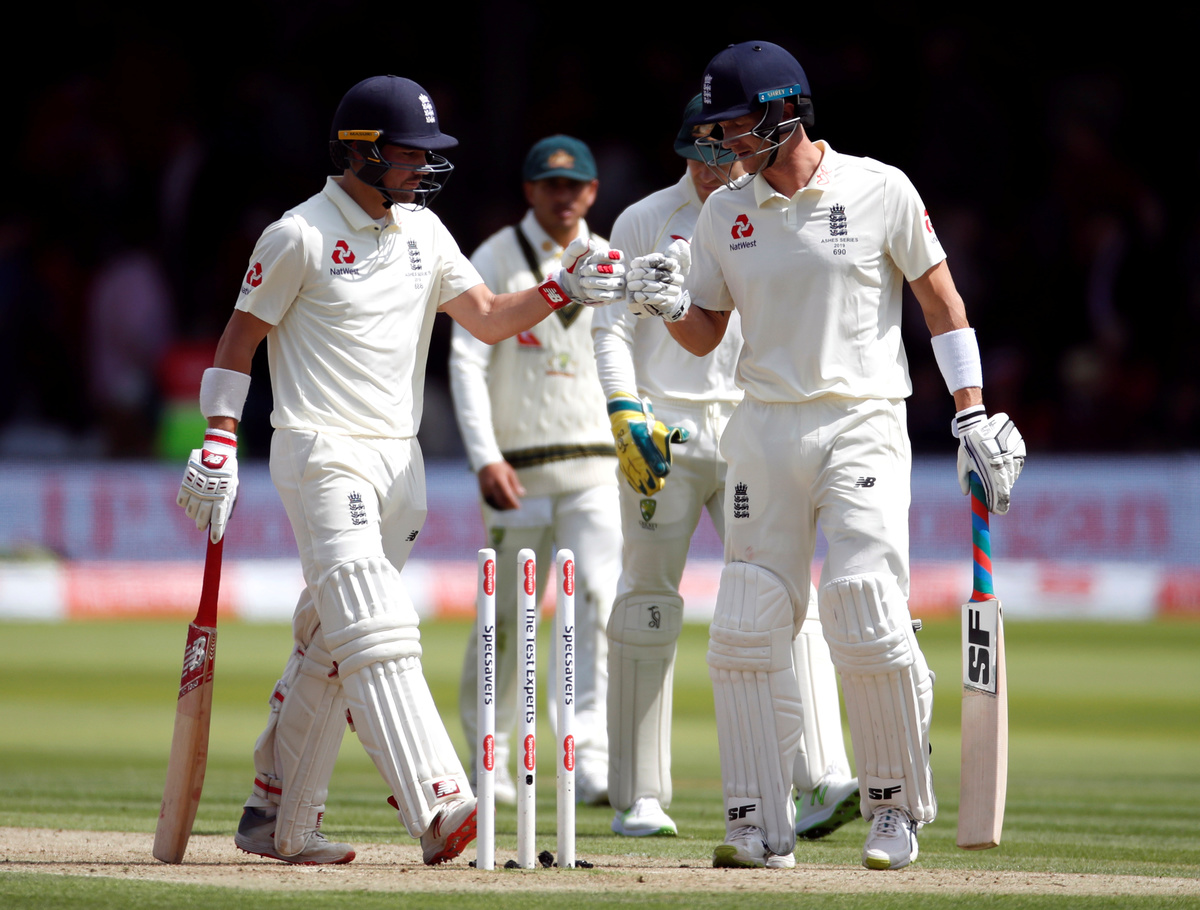 Bairstow and Chris Woakes steadied the ship with a seventh-wicket partnership of 72 in bright sunshine at the home of cricket before the latter gloved Cummins down the leg-side to Paine to fall for 32.