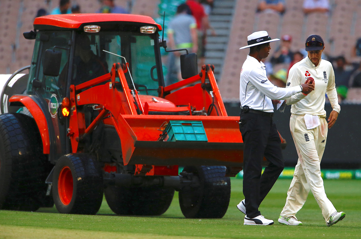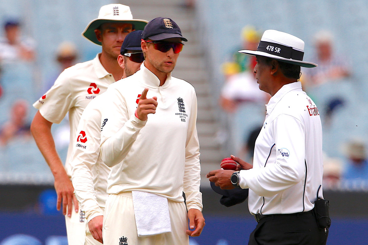 Cricket - Ashes test match - Australia v England - MCG, Melbourne, Australia, December 30, 2017. England's Stuart Broad celebrates with team mates after dismissing Australia's Shaun Marsh during the fifth day of the fourth Ashes cricket test match. REUTERS/David GrayCricket - Ashes test match - Australia v England - MCG, Melbourne, Australia, December 29, 2017. England's captain Joe Root shows the ball to umpire Kumar Dharmasena as groundsmen bring out rain covers during a rain delay on the fourth day of the fourth Ashes cricket test match. REUTERS/David Gray