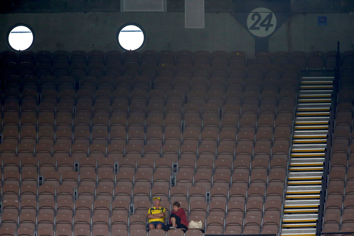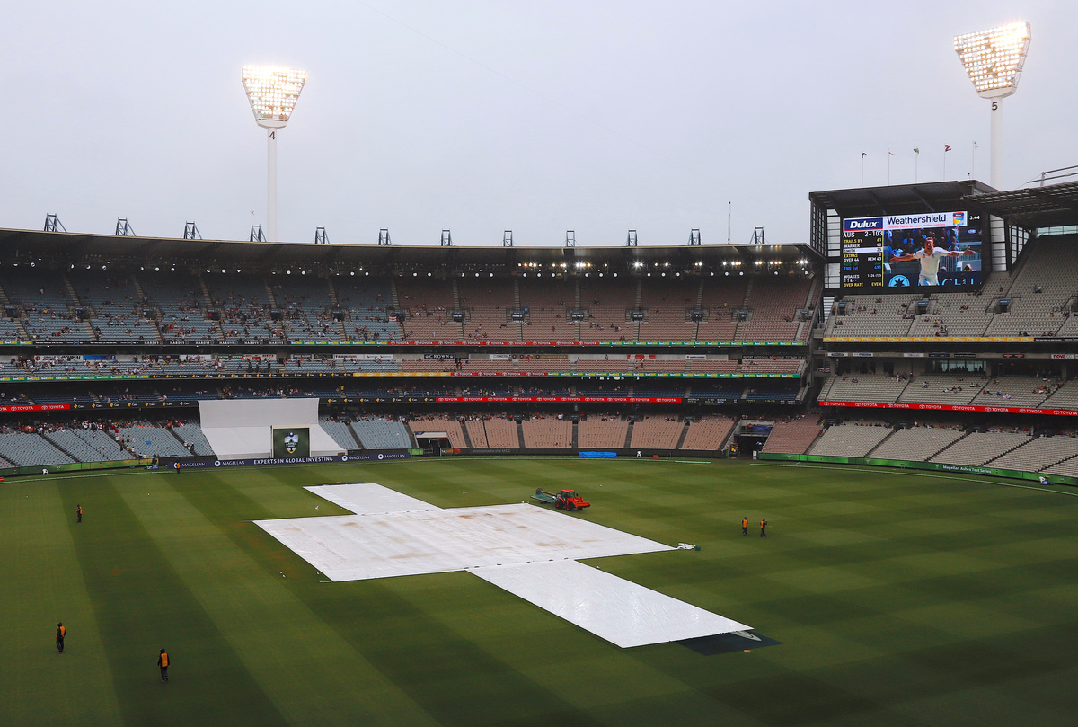 Cricket - Ashes test match - Australia v England - MCG, Melbourne, Australia, December 29, 2017. Spectators sit in the stands during a rain delay on the fourth day of the fourth Ashes cricket test match. REUTERS/David GrayCricket - Ashes test match - Australia v England - MCG, Melbourne, Australia, December 29, 2017. Covers can be seen over the pitch during a rain delay on the fourth day of the fourth Ashes cricket test match. REUTERS/David GrayCricket - Ashes test match - Australia v England - MCG, Melbourne, Australia, December 29, 2017. England's captain Joe Root appeals with wicketkeeper Jonny Bairstow during the fourth day of the fourth Ashes cricket test match. REUTERS/David GrayCricket - Ashes test match - Australia v England - MCG, Melbourne, Australia, December 29, 2017. England's James Anderson reacts after dismissing Australia's Usman Khawaja during the fourth day of the fourth Ashes cricket test match. REUTERS/David GrayCricket - Ashes test match - Australia v England - MCG, Melbourne, Australia, December 29, 2017. England's James Anderson celebrates with team mate Stuart Broad after dismissing Australia's Usman Khawaja during the fourth day of the fourth Ashes cricket test match. REUTERS/David GrayCricket - Ashes test match - Australia v England - MCG, Melbourne, Australia, December 29, 2017. England's captain Joe Root talks with umpire Sundaram Rav after a DRS appeal was unsuccessful during the fourth day of the fourth Ashes cricket test match. REUTERS/David GrayCricket - Ashes test match - Australia v England - MCG, Melbourne, Australia, December 29, 2017. Australia's Cameron Bancroft reacts after being bowled by England's Chris Woakes during the fourth day of the fourth Ashes cricket test match. REUTERS/David Gray