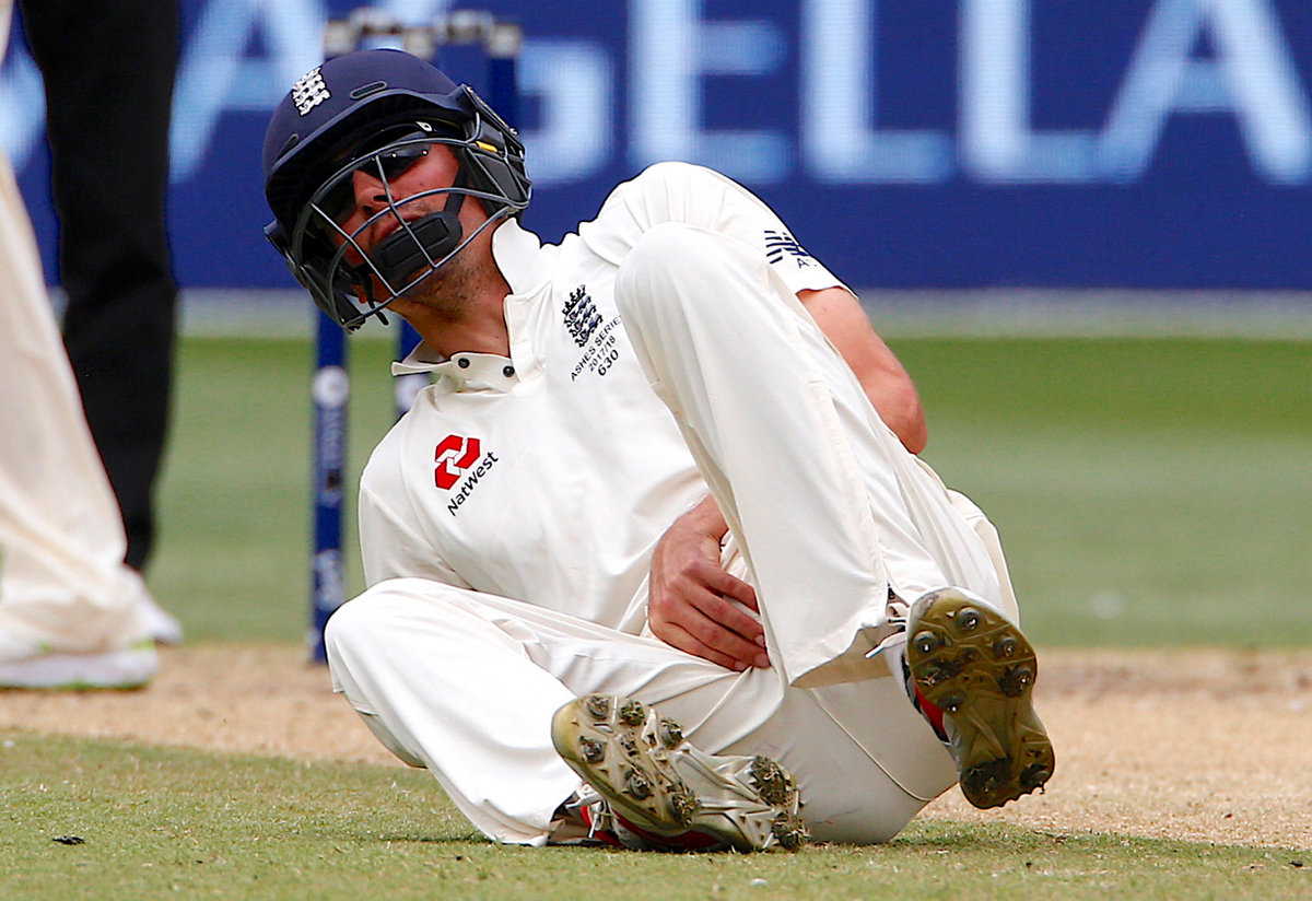 Cricket - Ashes test match - Australia v England - MCG, Melbourne, Australia, December 30, 2017. England's Alastair Cook reacts after being hit by a shot from Australia's Shaun Marsh during the fifth day of the fourth Ashes cricket test match. REUTERS/David Gray