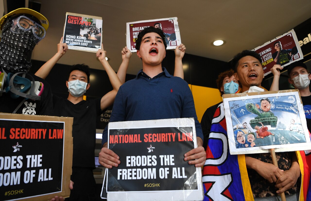 Drew Pavlou, a 23-year-old Australian activist who has been critical of China's human rights record, held a small protest outside the embassy, displaying a number of flags.