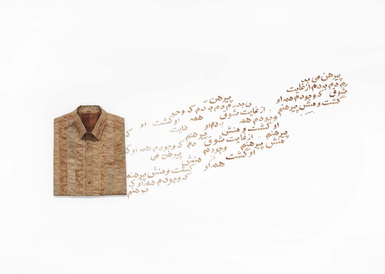 A shadow of the human form is an enduring theme, as in his wall piece Untitled (1995) consisting in a folded shirt made from lotus leaves set against a Sufi love poem painted in the shape of human shadow (when viewed diagonally). Beneath the philosophy, mathematics is inevitably at play in his work.
