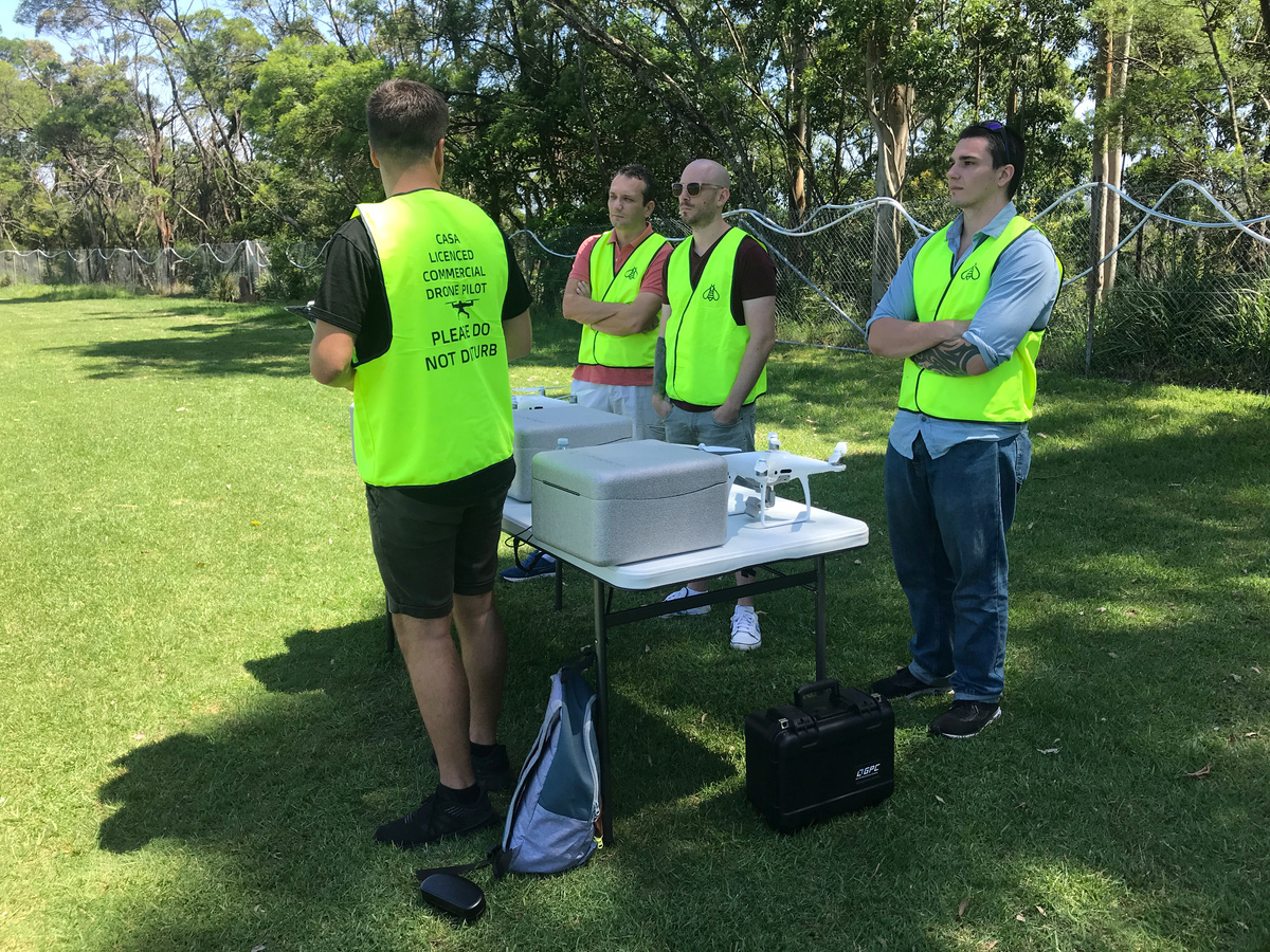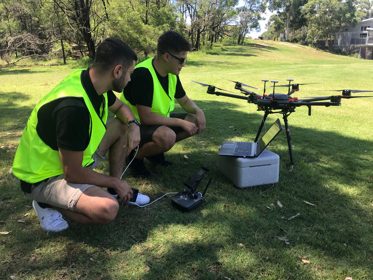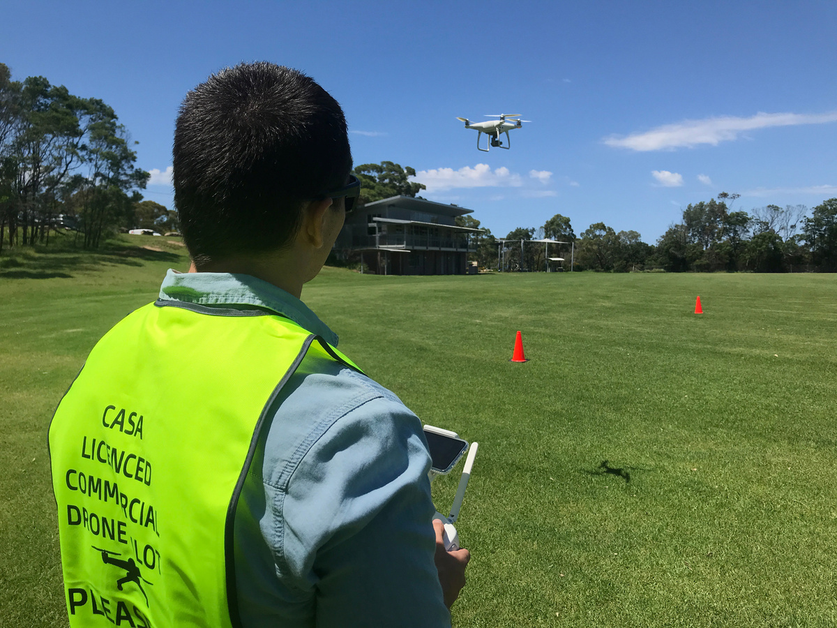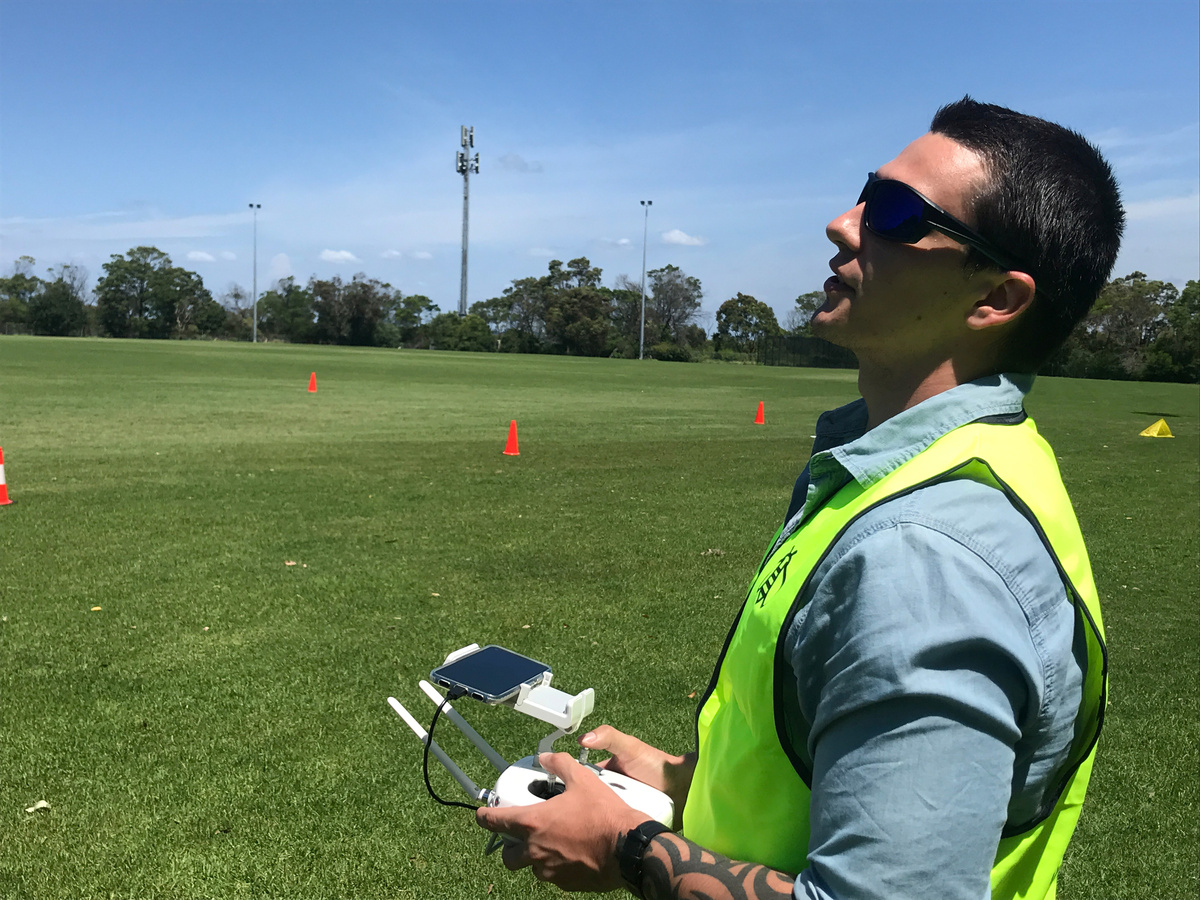 Instructors gaze watchfully from the shade of a tree as men in neon-green vests manipulate hand-held controllers clipped to mobile telephones as they direct drones flying over a vast Sydney field.