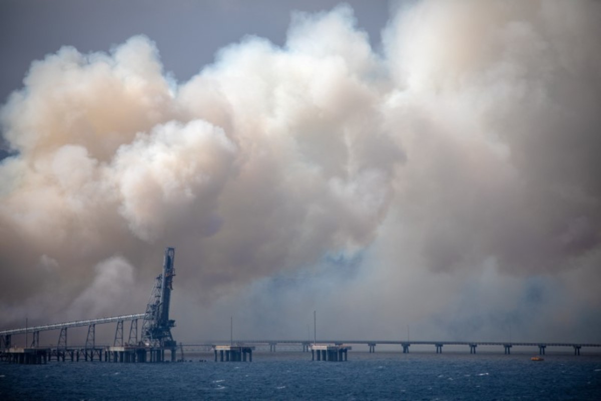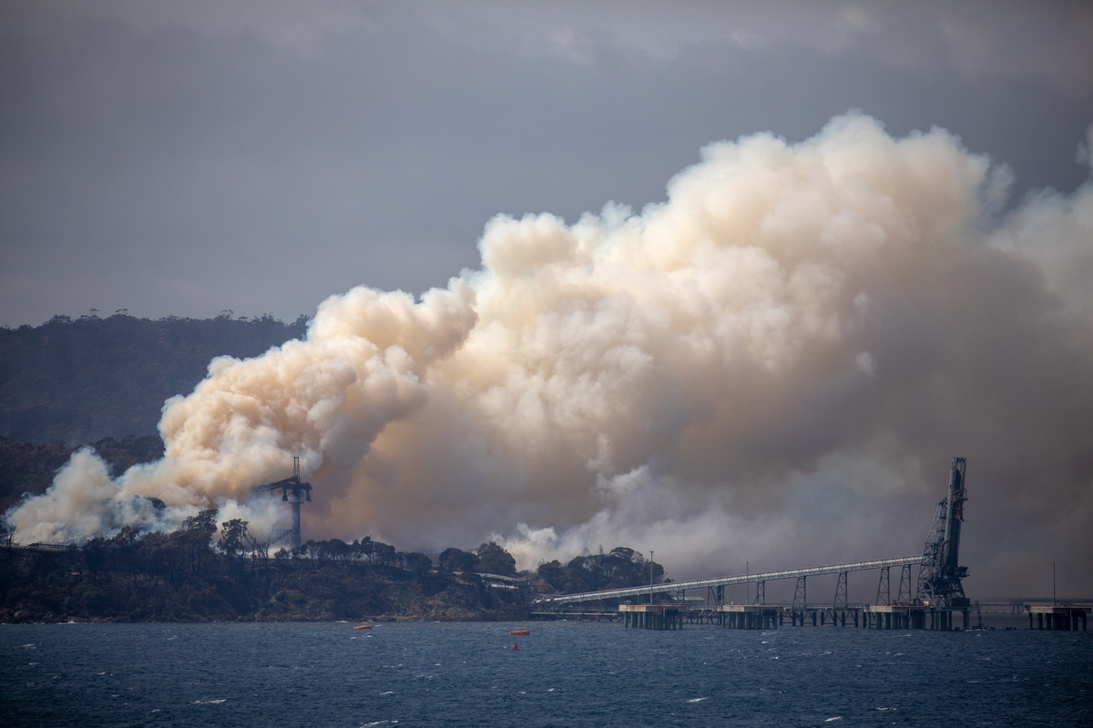 Smoke rises from the Eden Woodchip Mill, from a fire that has been blazing for days, after bushfires came close the previous week to Eden, Australia January 10, 2020. REUTERS/Alkis Konstantinidis