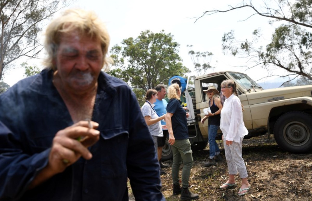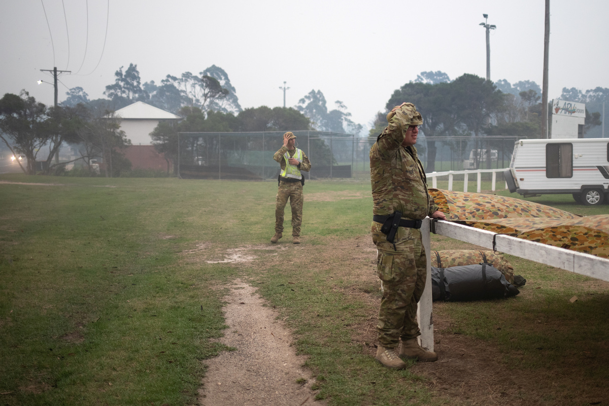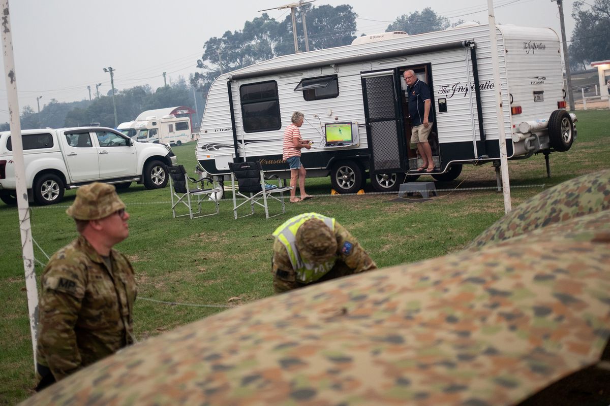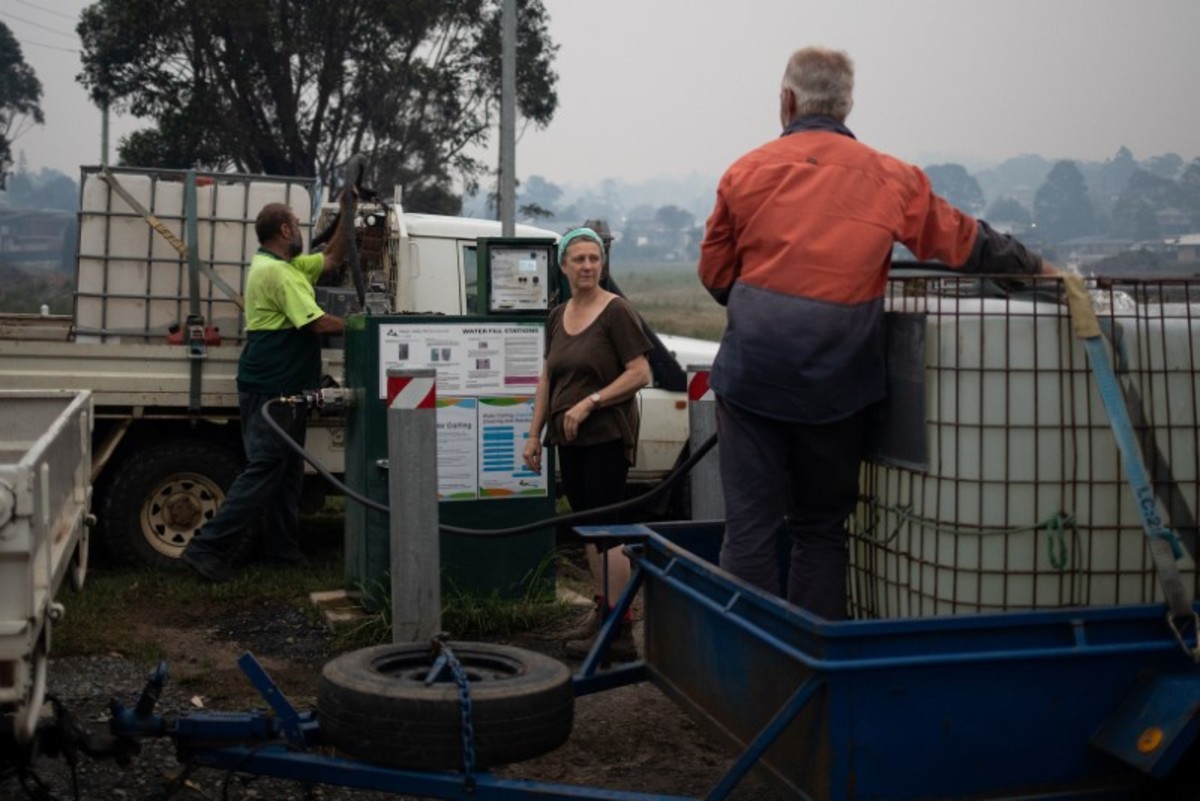 Kim Green (R) fills a tank with water to protect his farm from a possible bushfire as his wife Sherenee stands by, in the town of Eden, Australia January 10, 2020. REUTERS/Alkis KonstantinidisA man makes his way at the Eden Lookout as the Royal Australian Navy vessel HMAS Adelaide is covered by smoke in the town of Eden, Australia January 10, 2020. REUTERS/Alkis KonstantinidisA member of the Navy is seen at the deck of the Royal Australian Navy vessel HMAS Adelaide as smoke blankets the area in the town of Eden, Australia January 10, 2020. REUTERS/Alkis KonstantinidisMembers of a military support team deploy a tent as evacuees are seen at their caravan in the town of Eden, Australia January 10, 2020. REUTERS/Alkis KonstantinidisMembers of a military support team stand next to the beach as smoke blankets the town of Eden, Australia January 10, 2020. REUTERS/Alkis KonstantinidisBurnt bicycles are left by the beach amongst burnt trees where people had previously taken shelter during a fire on New Years' Eve in Mallacoota, Australia January 10, 2020. REUTERS/Tracey NearmyGenoa locals Rob and Dot de Geus are given water and sandwiches by the Mallacoota Health Service in Genoa, Australia January 10, 2020. REUTERS/Tracey NearmyA fire extinguisher sits in front of a fire truck and an army vehicle at the CFA in Mallacoota, Australia January 10, 2020. REUTERS/Tracey NearmySoldier Sapper Adam Bourke 22ER Of Victoria rests in front of firefighter uniforms at the Country Fire Authority (CFA) in Mallacoota, Australia January 10, 2020. REUTERS/Tracey NearmySoldiers sit on a beach amongst burnt trees where people had previously taken shelter during a fire on New Year's Eve in Mallacoota, Australia January 10, 2020. REUTERS/Tracey NearmyAn Erickson Air Crane is seen fighting a bushfire burning in bushland at Penrose, in the NSW Southern Highlands, Australia, January 10, 2020. AAP Image/Dan Himbrechts/via REUTERS