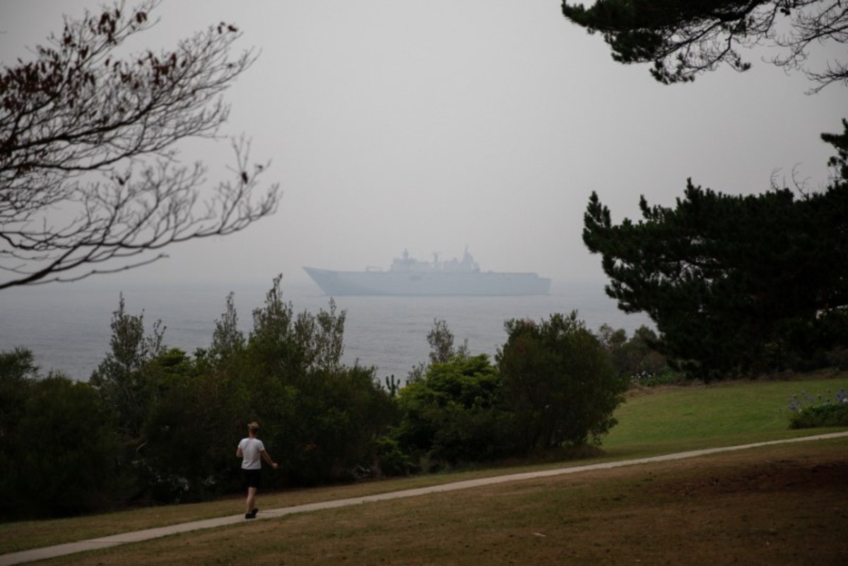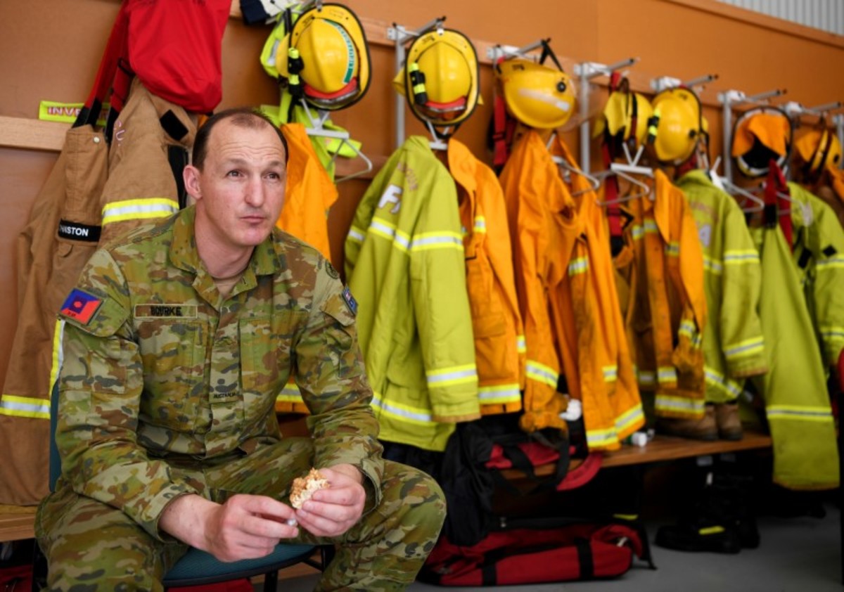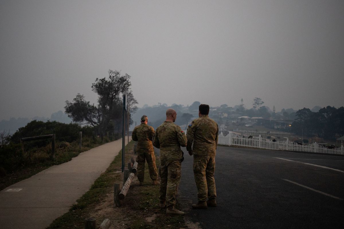 Kim Green (R) fills a tank with water to protect his farm from a possible bushfire as his wife Sherenee stands by, in the town of Eden, Australia January 10, 2020. REUTERS/Alkis KonstantinidisA man makes his way at the Eden Lookout as the Royal Australian Navy vessel HMAS Adelaide is covered by smoke in the town of Eden, Australia January 10, 2020. REUTERS/Alkis KonstantinidisA member of the Navy is seen at the deck of the Royal Australian Navy vessel HMAS Adelaide as smoke blankets the area in the town of Eden, Australia January 10, 2020. REUTERS/Alkis KonstantinidisMembers of a military support team deploy a tent as evacuees are seen at their caravan in the town of Eden, Australia January 10, 2020. REUTERS/Alkis KonstantinidisMembers of a military support team stand next to the beach as smoke blankets the town of Eden, Australia January 10, 2020. REUTERS/Alkis KonstantinidisBurnt bicycles are left by the beach amongst burnt trees where people had previously taken shelter during a fire on New Years' Eve in Mallacoota, Australia January 10, 2020. REUTERS/Tracey NearmyGenoa locals Rob and Dot de Geus are given water and sandwiches by the Mallacoota Health Service in Genoa, Australia January 10, 2020. REUTERS/Tracey NearmyA fire extinguisher sits in front of a fire truck and an army vehicle at the CFA in Mallacoota, Australia January 10, 2020. REUTERS/Tracey NearmySoldier Sapper Adam Bourke 22ER Of Victoria rests in front of firefighter uniforms at the Country Fire Authority (CFA) in Mallacoota, Australia January 10, 2020. REUTERS/Tracey NearmySoldiers sit on a beach amongst burnt trees where people had previously taken shelter during a fire on New Year's Eve in Mallacoota, Australia January 10, 2020. REUTERS/Tracey NearmyAn Erickson Air Crane is seen fighting a bushfire burning in bushland at Penrose, in the NSW Southern Highlands, Australia, January 10, 2020. AAP Image/Dan Himbrechts/via REUTERS
