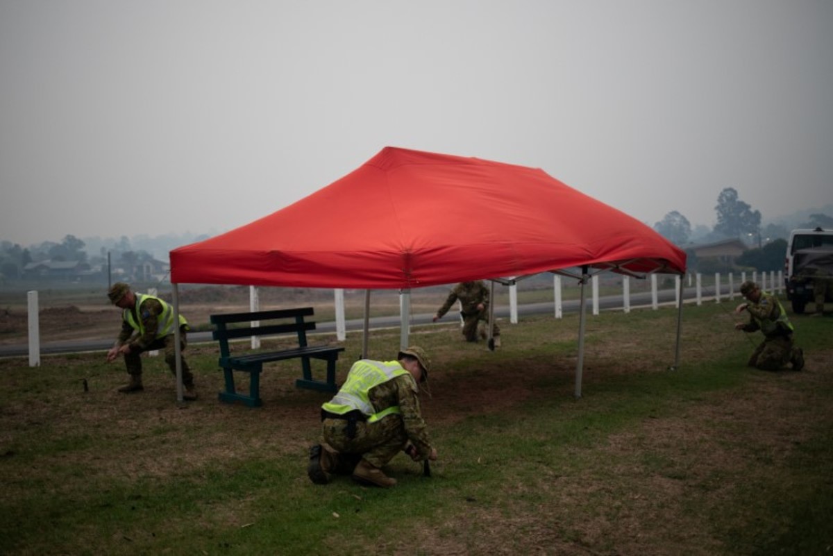 Members of a military support team deploy a tent as smoke begins to blanket the town of Eden, Australia January 10, 2020. REUTERS/Alkis Konstantinidis