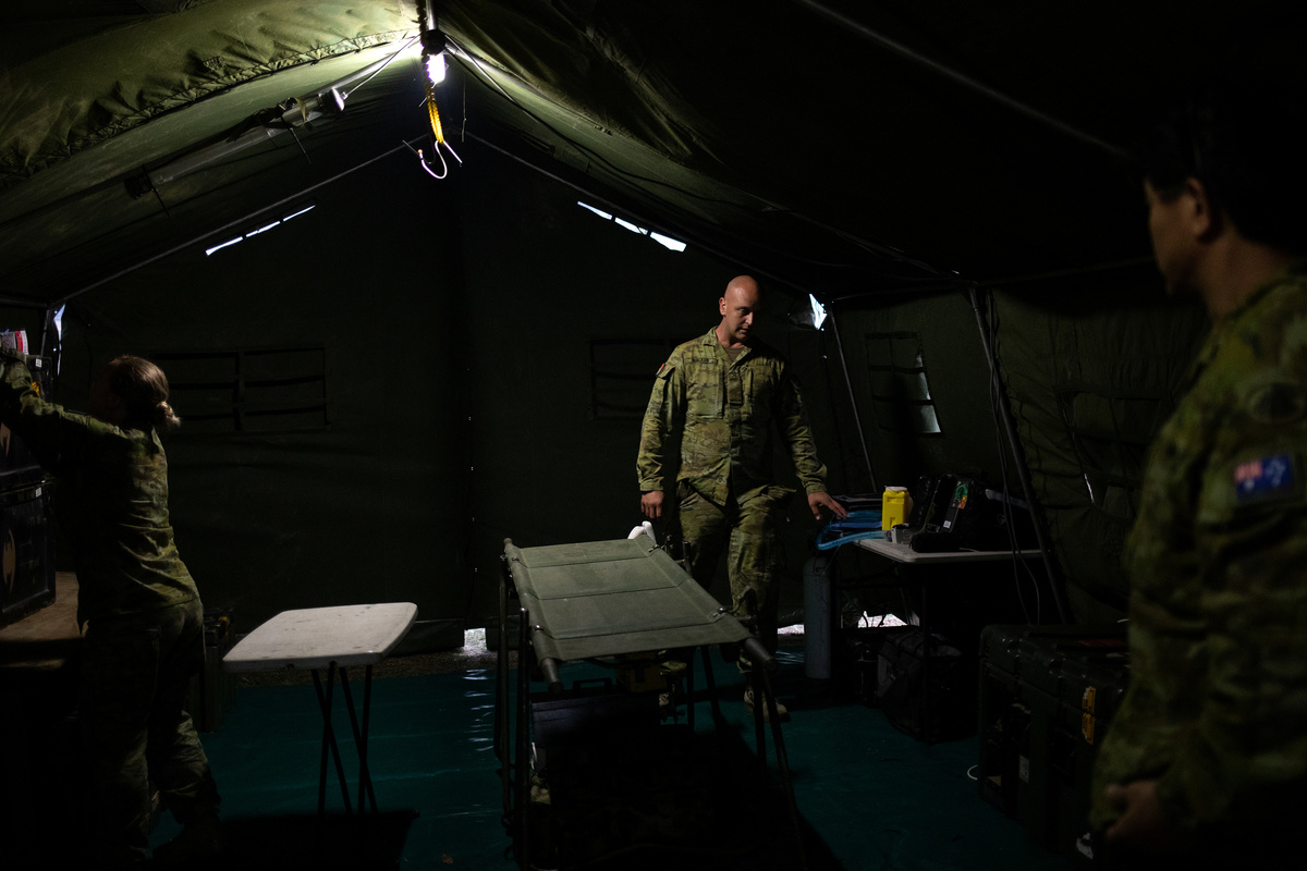 Members of a military support team prepare a field hospital in the town of Eden, Australia January 10, 2020. REUTERS/Alkis Konstantinidis