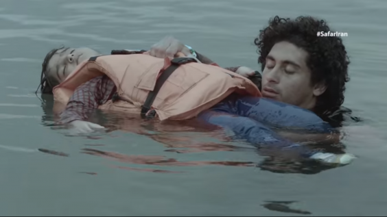 Other relatives have already drowned on-camera in preceding scenes, with one man committing suicide by removing his life jacket. The struggling man is seen surrounded by the bodies of drowned and drowning people, and the action cuts to grieving relatives in Afghanistan.