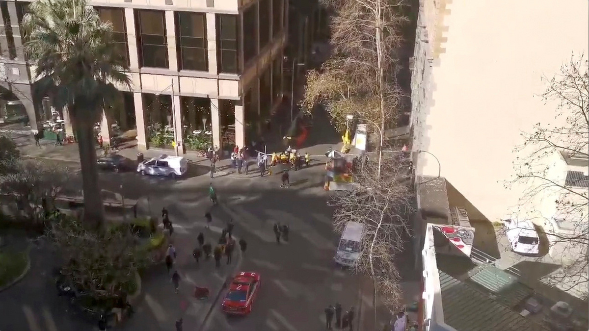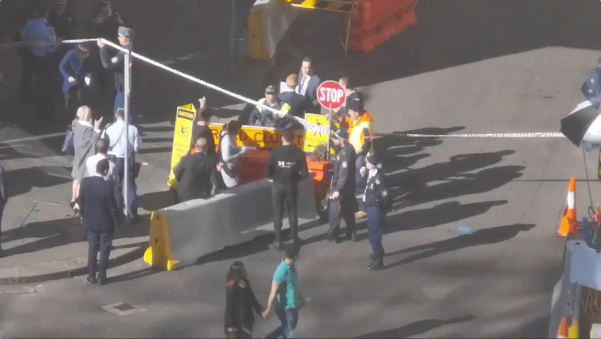 The incident brought downtown traffic to a halt in Australia's biggest city. Video images on Twitter showed a young man running across an intersection and jumping onto a car hood, yelling and waving what appeared to be a long-bladed knife.