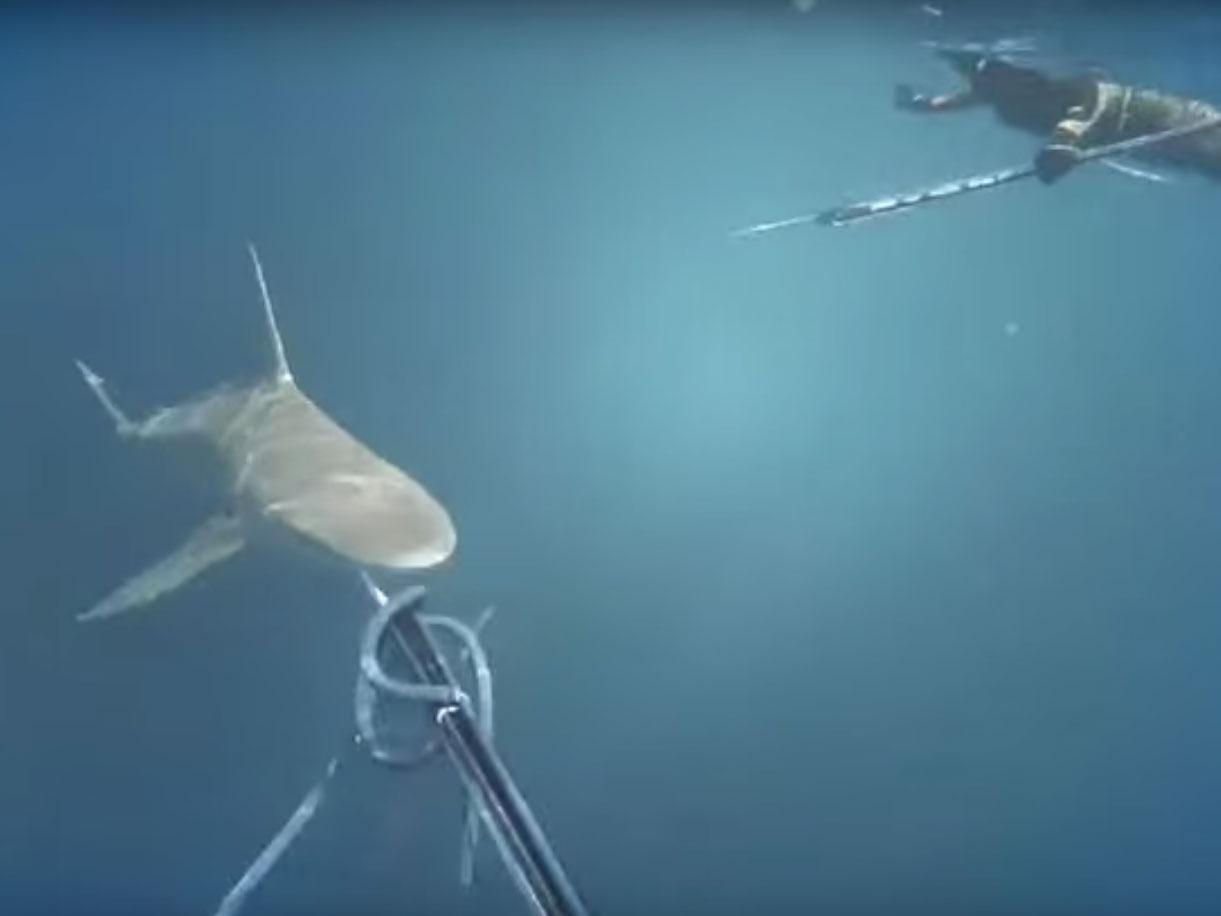 Footage has emerged of the moment a spearfisher is confronted by a shark heading directly for him in the open sea – and he is forced to shoot it in defence.