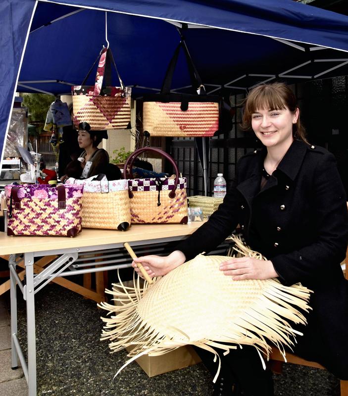 Using the fingers of both hands, she quickly wove together thin, belt-like strips of cypress wood to make a type of hat called "hinokigasa." Passing shoppers stopped to peer curiously at Maree, drawn by the skillful movements of her hands.