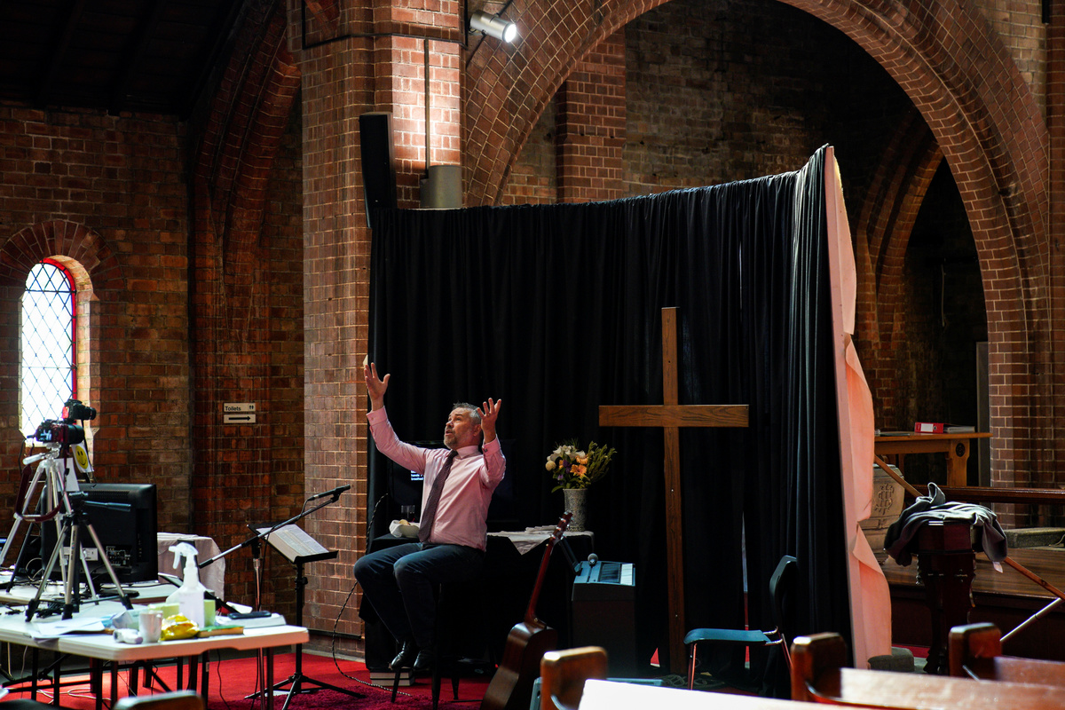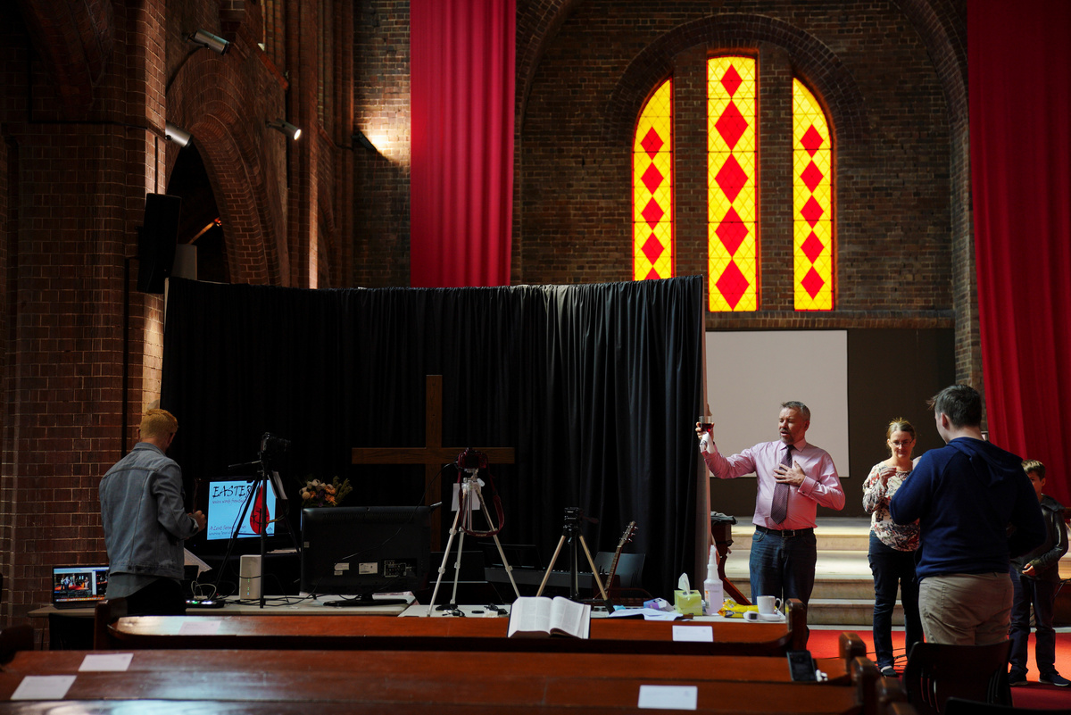 Pastor Matt Johnson leads an Easter service that is live-streamed via the internet for parishioners due to social gathering restrictions implemented to curb the spread of the coronavirus disease (COVID-19), at One1Seven evangelical Anglican church in Sydney, Australia, April 12, 2020. REUTERS/Loren Elliott