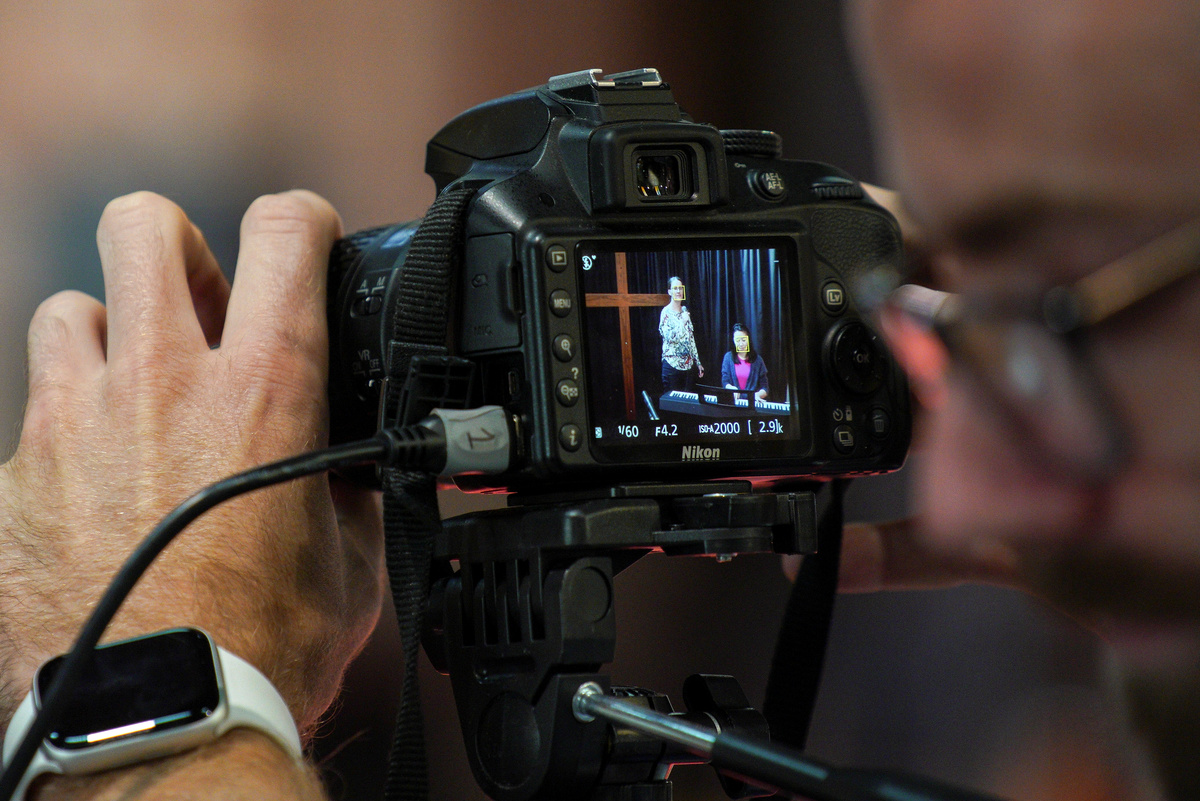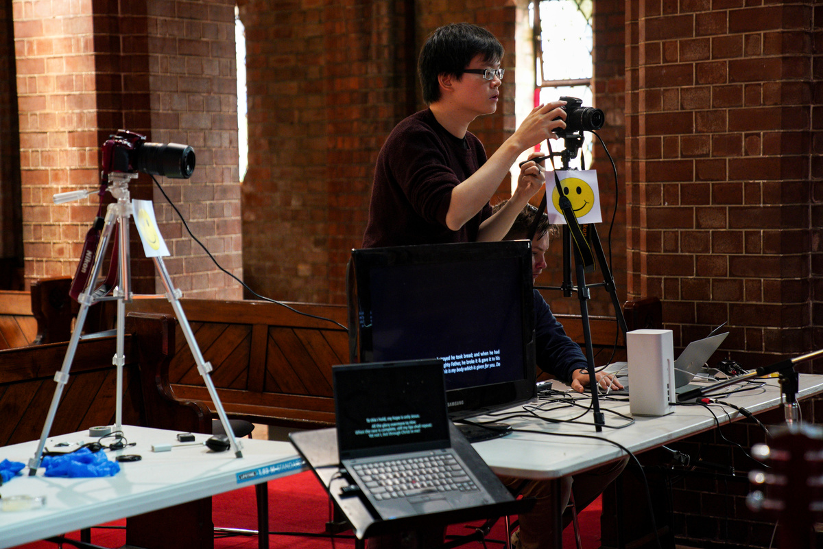 A church member films music being performed by pastor Matt Johnson's wife Naomi Johnson and Siang Ching Ngu for an Easter service that is live-streamed via the internet for parishioners due to social gathering restrictions implemented to curb the spread of the coronavirus disease (COVID-19), at One1Seven evangelical Anglican church in Sydney, Australia, April 12, 2020. REUTERS/Loren Elliott