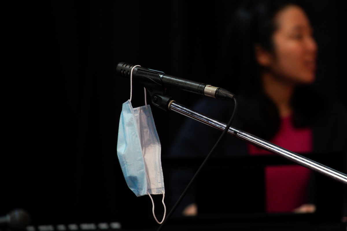 A protective face mask hangs from a microphone at One1Seven evangelical Anglican church in Sydney, where pastor Matt Johnson leads an Easter service that is live-streamed via the internet for parishioners due to social gathering restrictions implemented to curb the spread of the coronavirus disease (COVID-19) in Australia, April 12, 2020. REUTERS/Loren Elliott