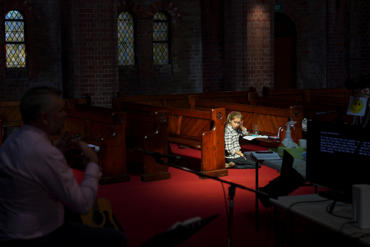 Rachel Johnson, 10, watches from the pews as her father, pastor Matt Johnson leads an Easter service that is live-streamed via the internet for parishioners due to social gathering restrictions implemented to curb the spread of the coronavirus disease (COVID-19), at One1Seven evangelical Anglican church in Sydney, Australia, April 12, 2020. REUTERS/Loren Elliott