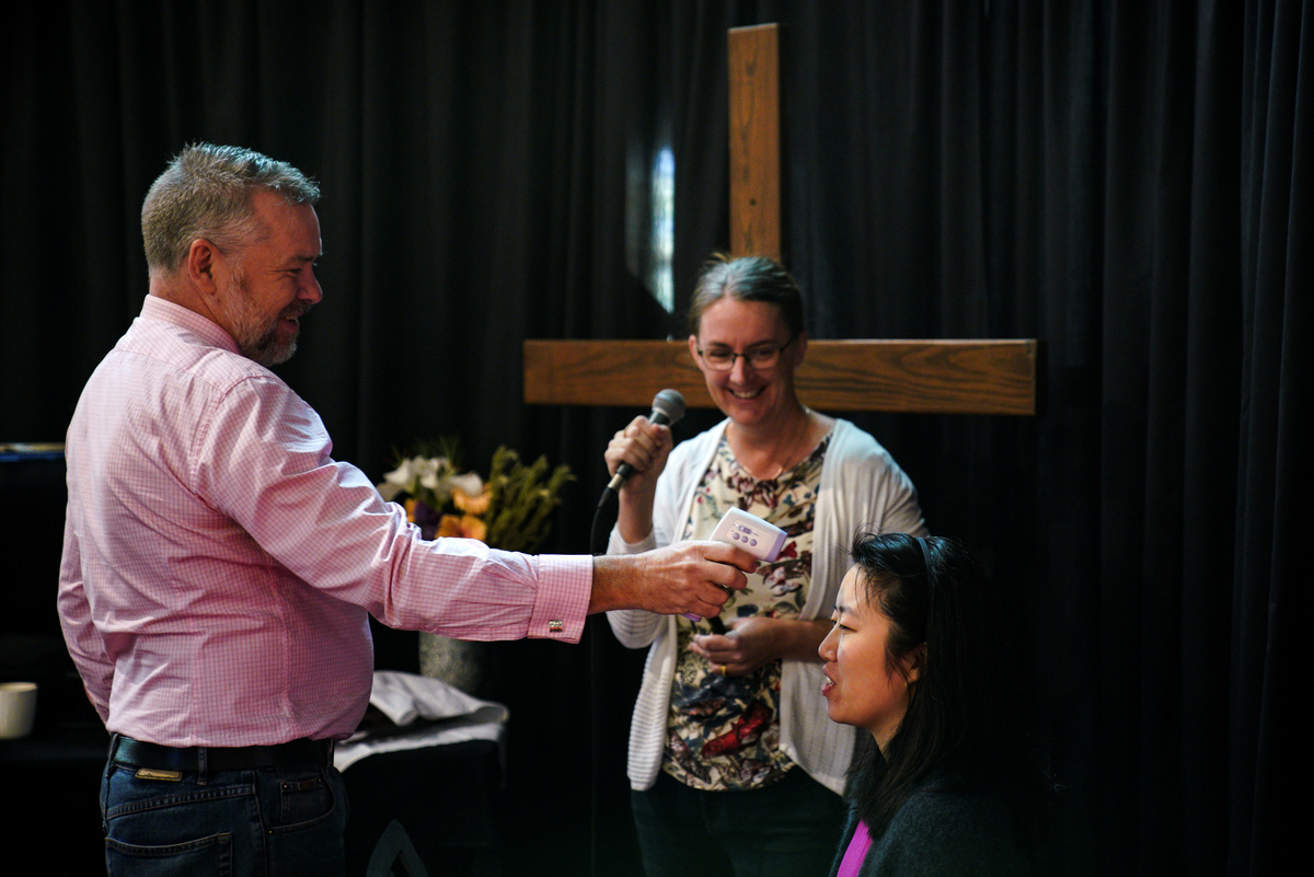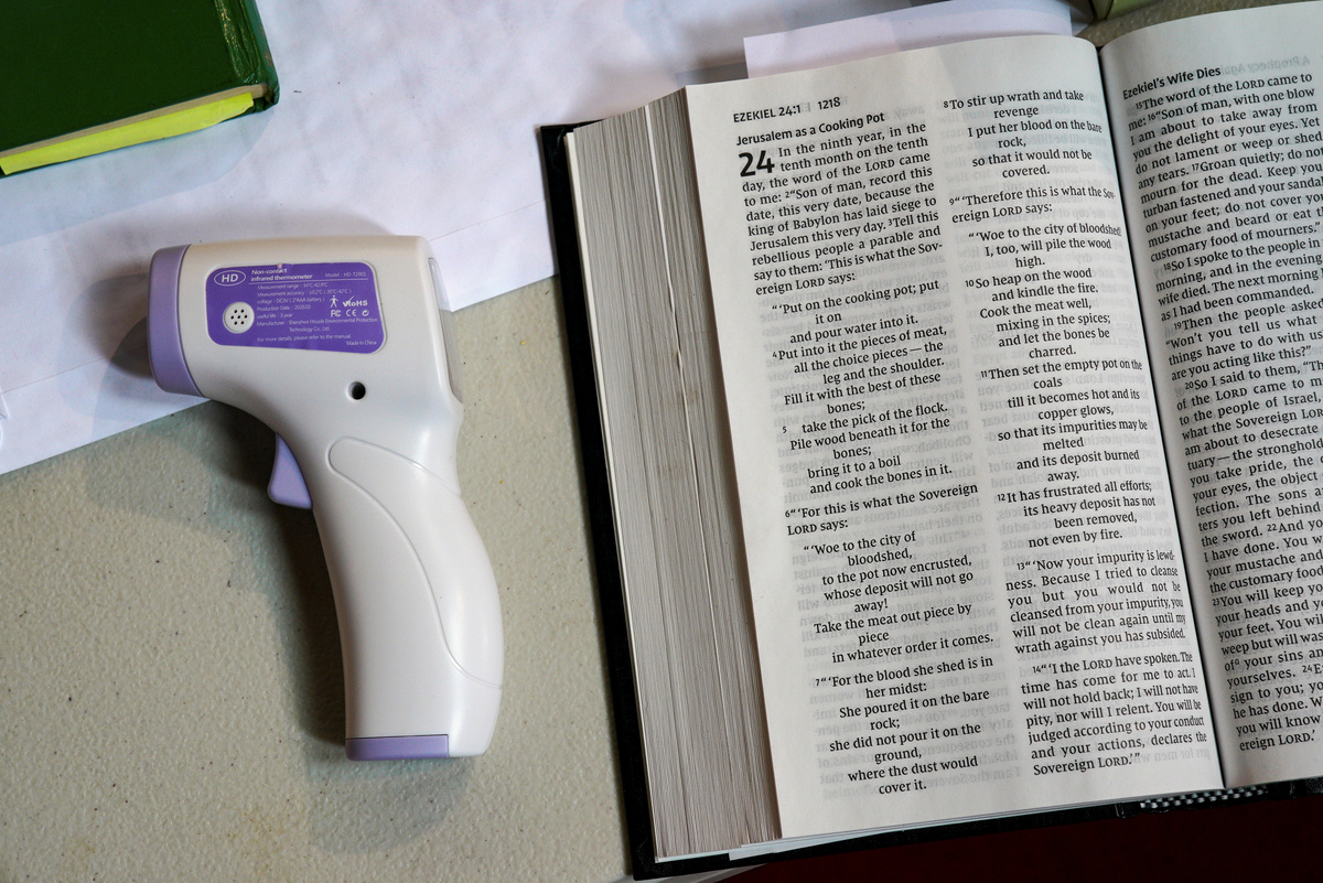 A non-contact infrared thermometer and a Bible are seen at One1Seven evangelical Anglican church in Sydney, where pastor Matt Johnson leads an Easter service that is live-streamed via the internet for parishioners due to social gathering restrictions implemented to curb the spread of the coronavirus disease (COVID-19) in Australia, April 12, 2020. REUTERS/Loren ElliottPastor Matt Johnson reacts while leading an Easter service which is live-streamed via the internet for parishioners due to social gathering restrictions implemented to curb the spread of the coronavirus disease (COVID-19), at One1Seven evangelical Anglican church in Sydney, Australia, April 12, 2020. REUTERS/Loren ElliottChurch member Osborn Fong films an Easter service led by pastor Matt Johnson which is live-streamed via the internet for parishioners due to social gathering restrictions implemented to curb the spread of the coronavirus disease (COVID-19), at One1Seven evangelical Anglican church in Sydney, Australia, April 12, 2020. REUTERS/Loren ElliottChurch member Siang Ching Ngu gets her temperature checked by pastor Matt Johnson before performing music during an Easter service which is live-streamed via the internet for parishioners due to social gathering restrictions implemented to curb the spread of the coronavirus disease (COVID-19), at One1Seven evangelical Anglican church in Sydney, Australia, April 12, 2020. REUTERS/Loren Elliott
