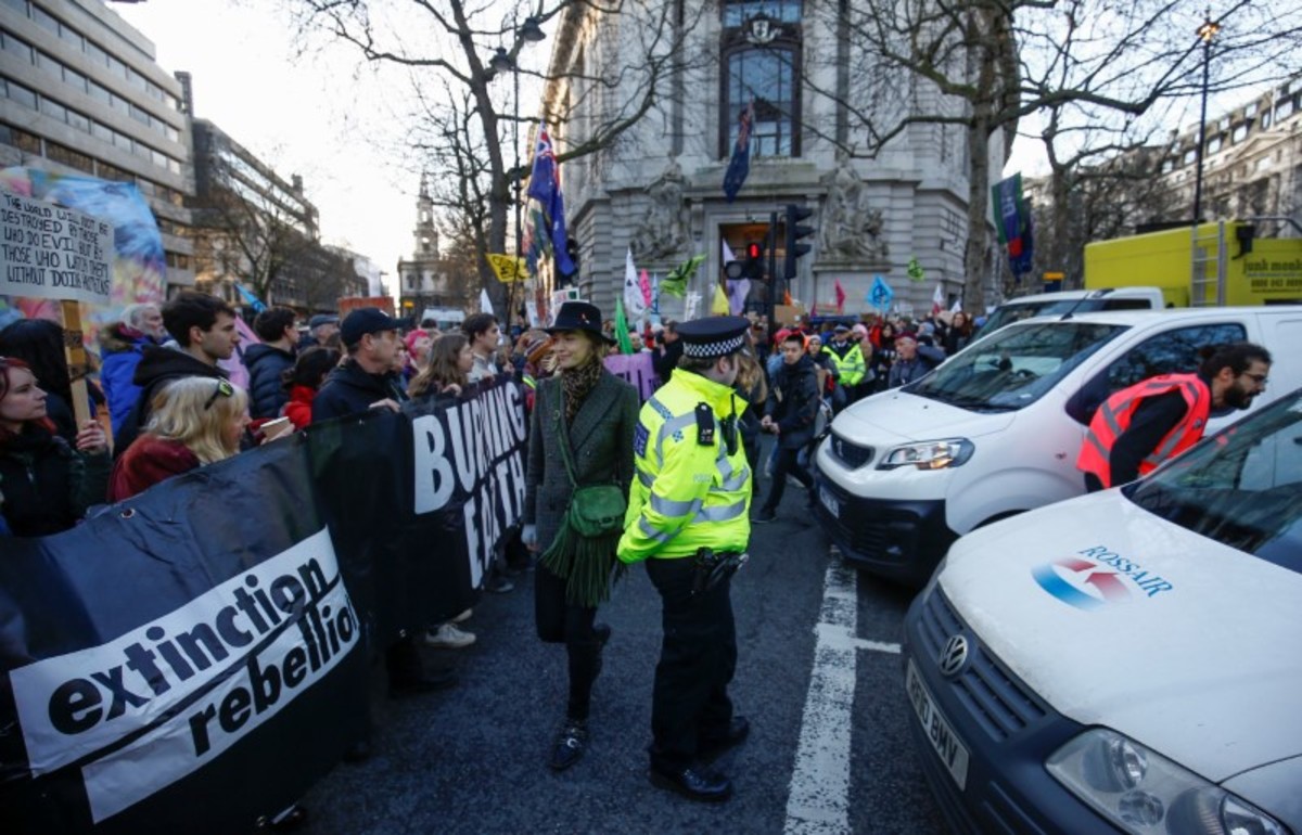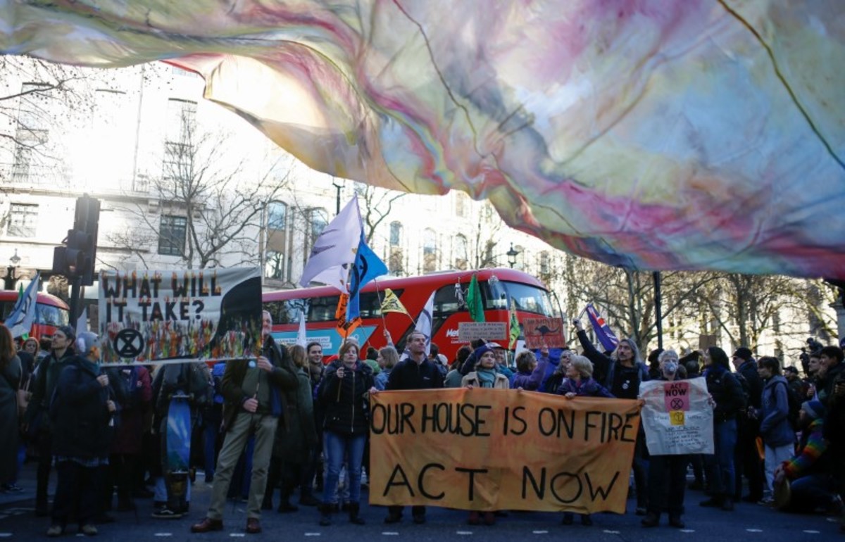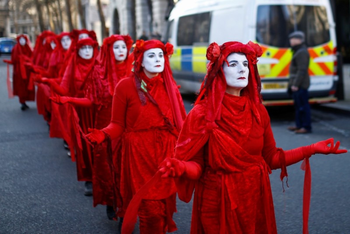 "Red Brigade" activists walk as they participate in a demonstration against the Australian government's inaction over climate change despite the bushfires crisis, outside the Australian Embassy in London, Britain, January 10, 2020. REUTERS/Henry Nicholls