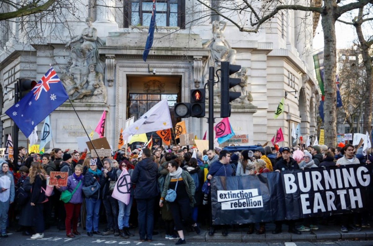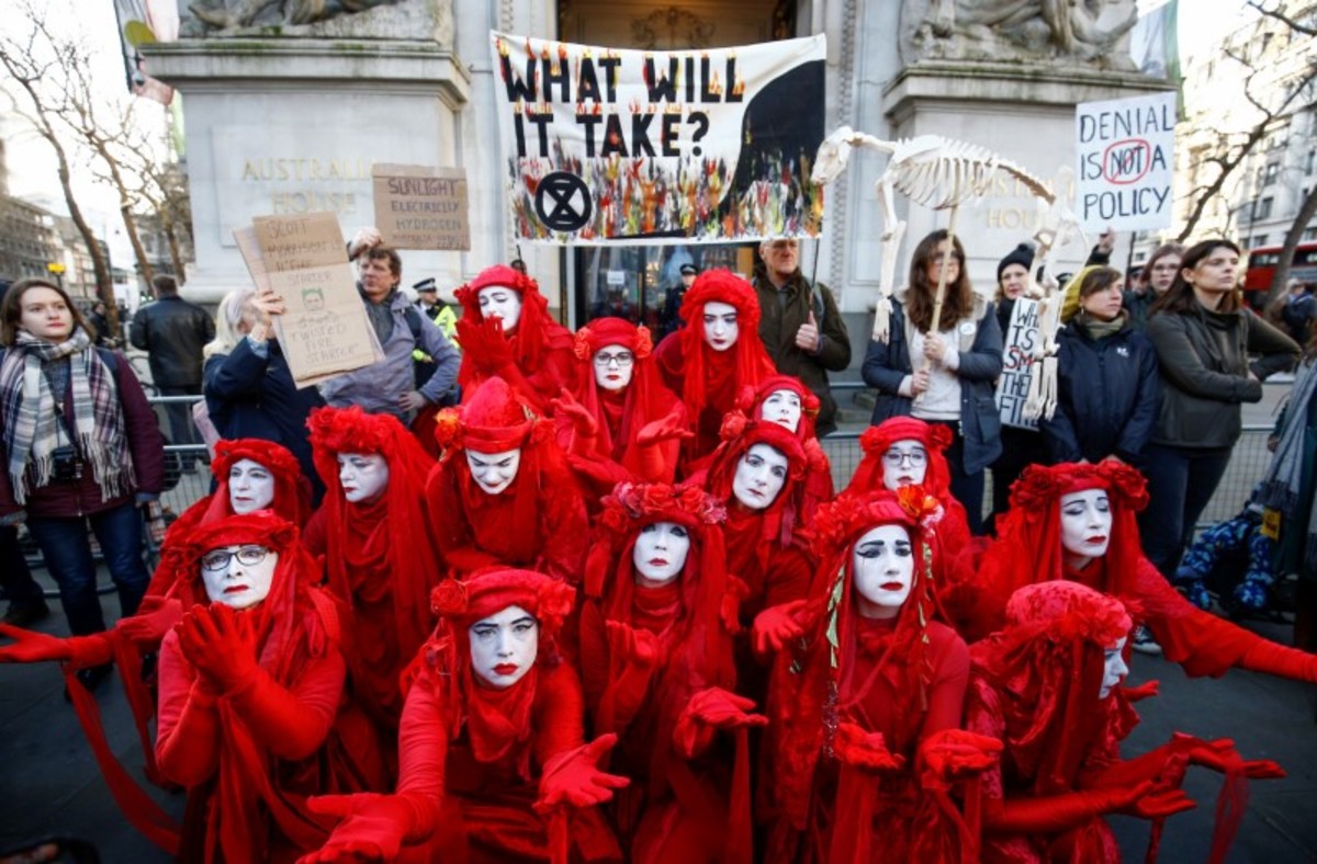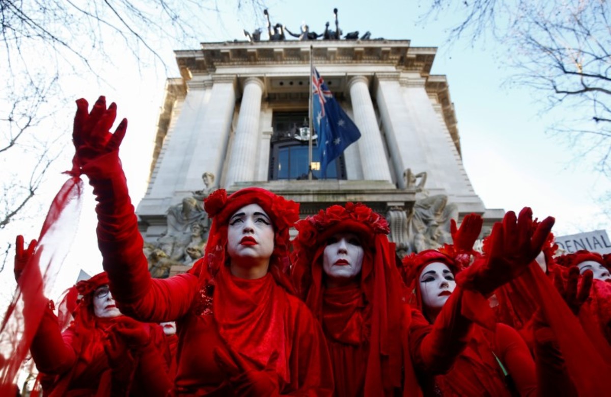"Red Brigade" gesture during a demonstration against the Australian government's inaction over climate change despite the bushfires crisis, outside the Australian Embassy in London, Britain, January 10, 2020. REUTERS/Henry Nicholls