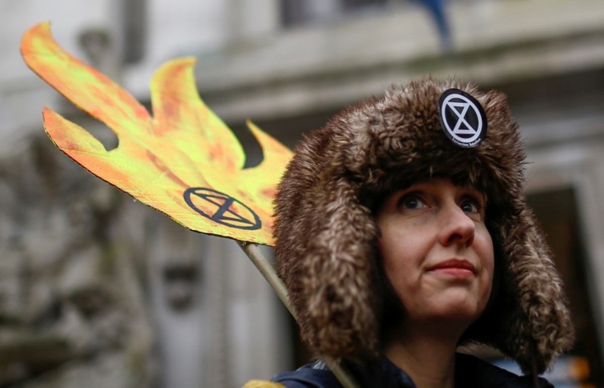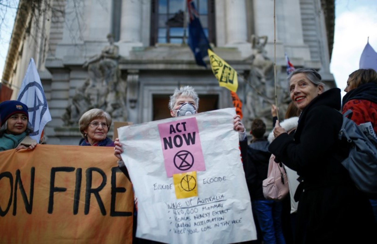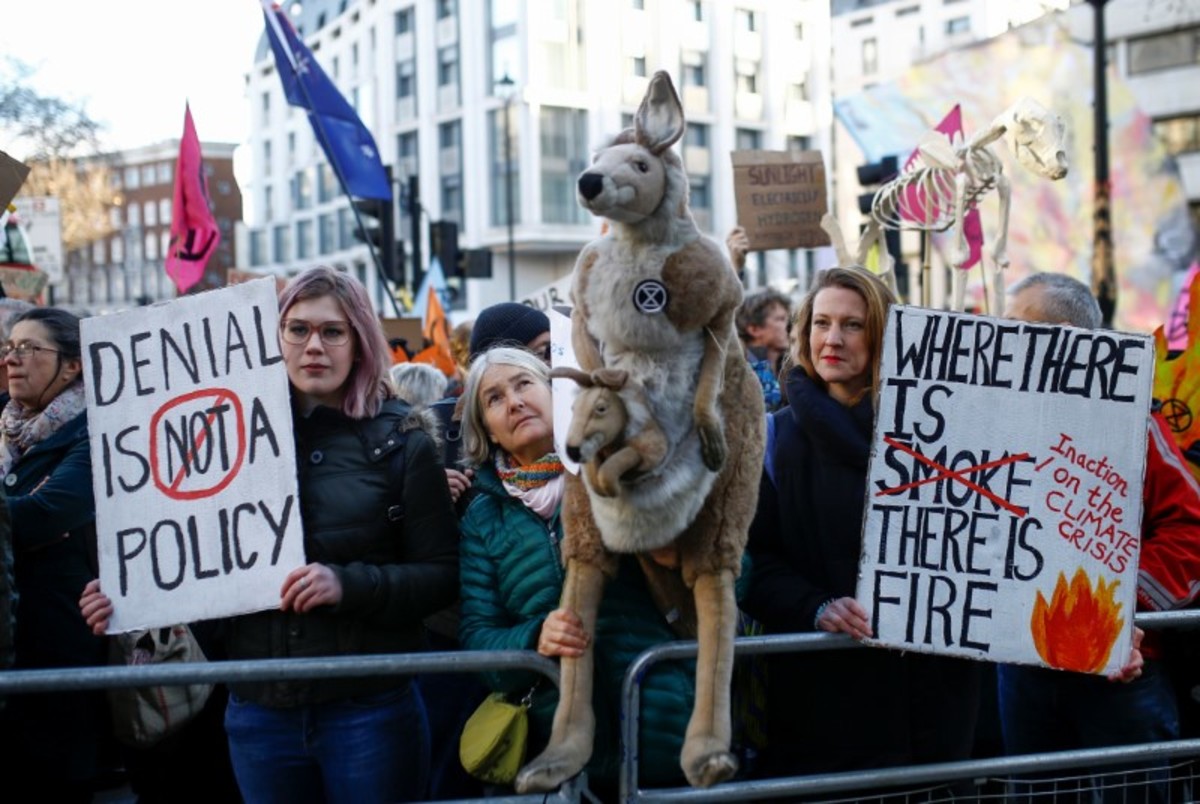 A protester attends a demonstration against the Australian government's inaction over climate change despite the bushfires crisis, outside the Australian Embassy in London, Britain, January 10, 2020. REUTERS/Henry Nicholls