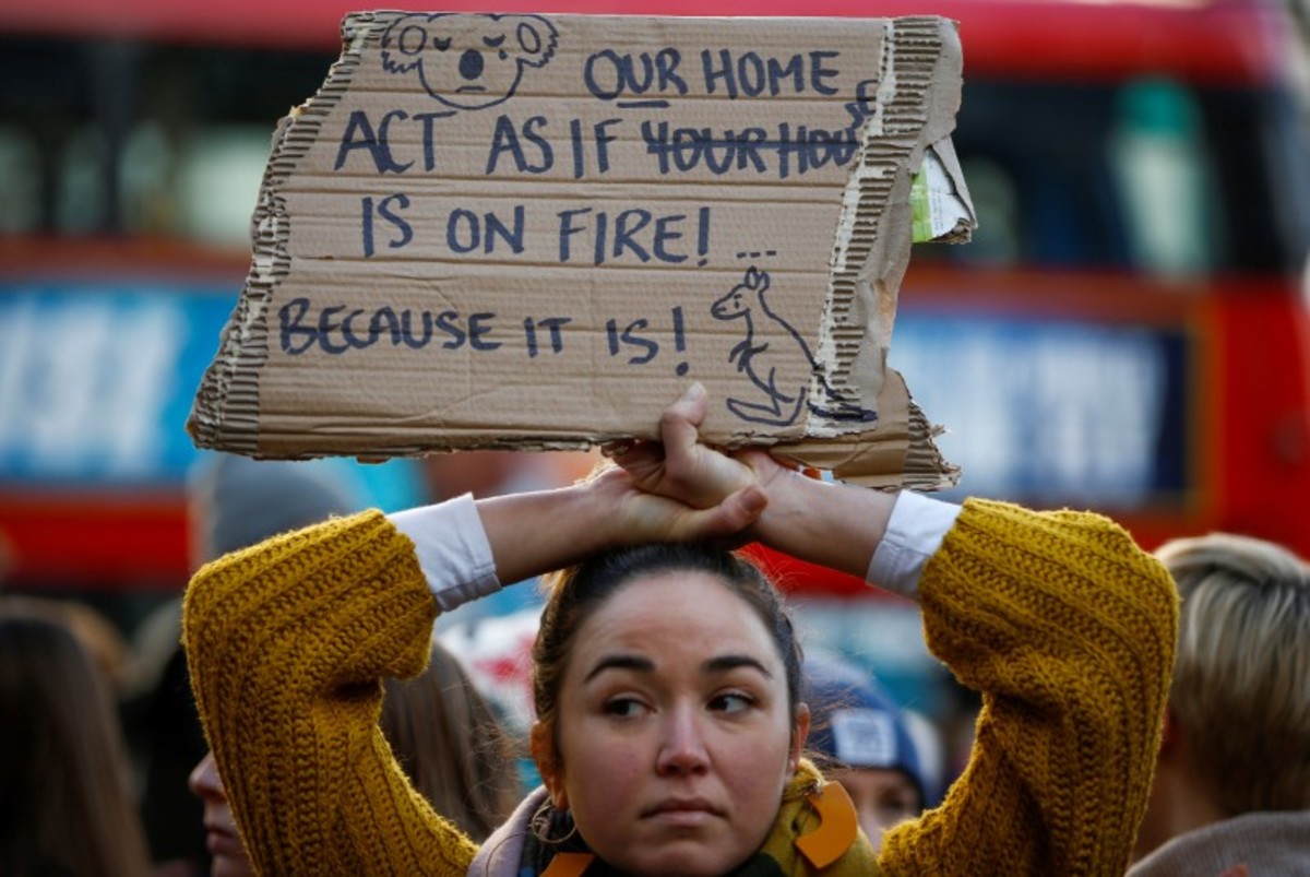 A protester holds a banner as she demonstrates against the Australian government's inaction over climate change despite the bushfires crisis, outside the Australian Embassy in London, Britain, January 10, 2020. REUTERS/Henry Nicholls