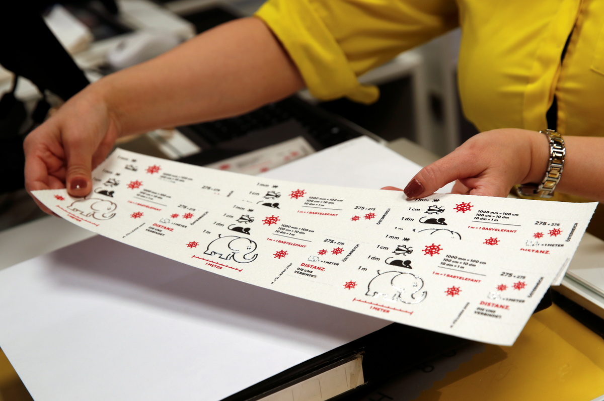 The 2.75 euro "corona stamp" comes in sheets 10 cm wide, or a tenth of the 1 metre that the government advises members of the public to keep apart from each other, symbolised in official campaigns by a baby elephant.