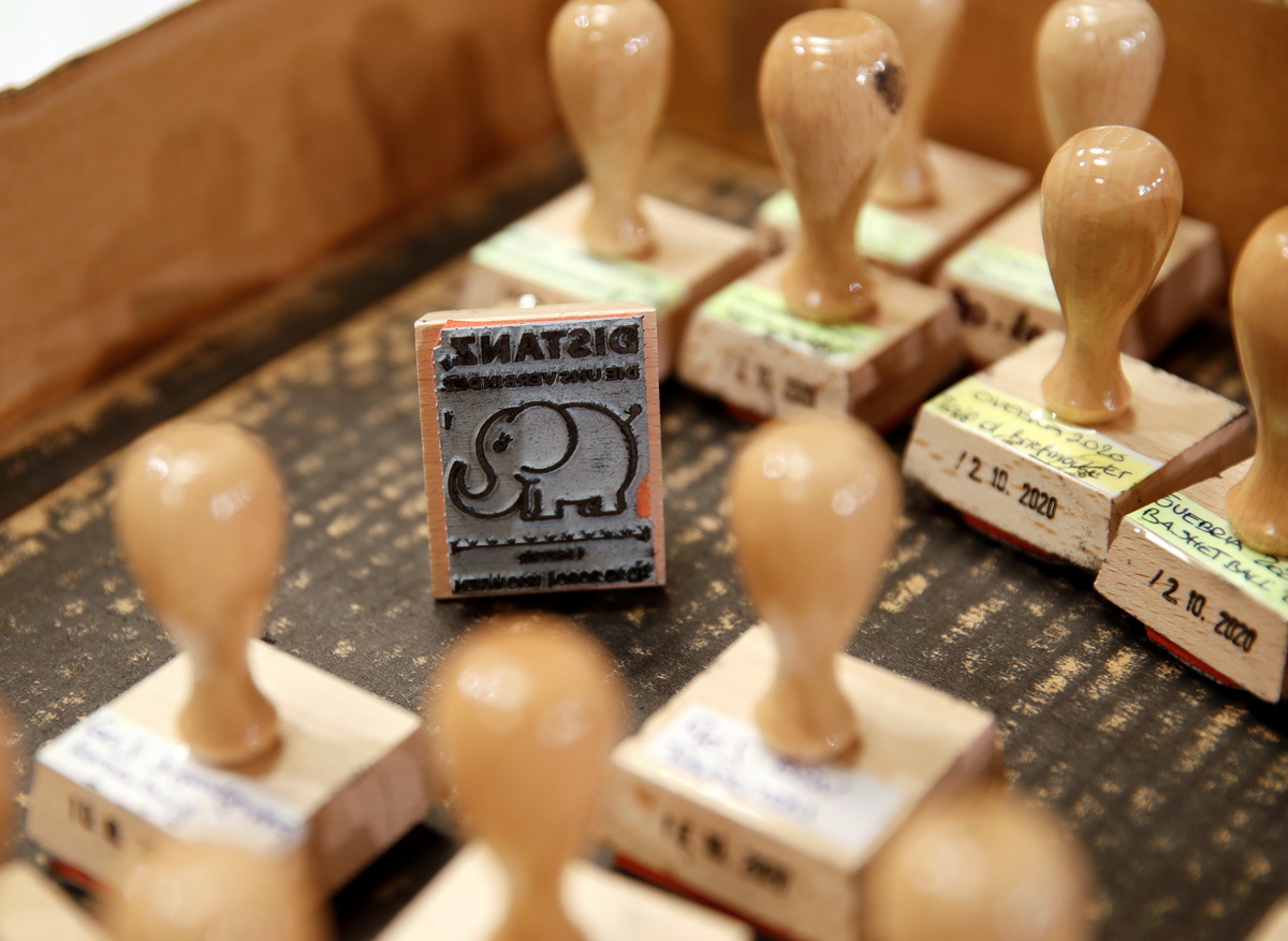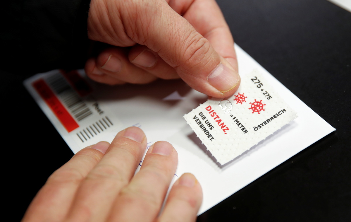 A seal for a so called "corona stamp" is seen in a post office, as the 2.75 euro "corona stamp" is printed on three-ply toilet paper and sold individually as part of a 10 cm wide sheet, in Vienna, Austria October 23, 2020. REUTERS/Leonhard FoegerA letter with a so called "corona stamp" attached is seen in a post office, as the 2.75 euro "corona stamp" is printed on three-ply toilet paper and sold individually as part of a 10 cm wide sheet, in Vienna, Austria October 23, 2020. REUTERS/Leonhard Foeger
