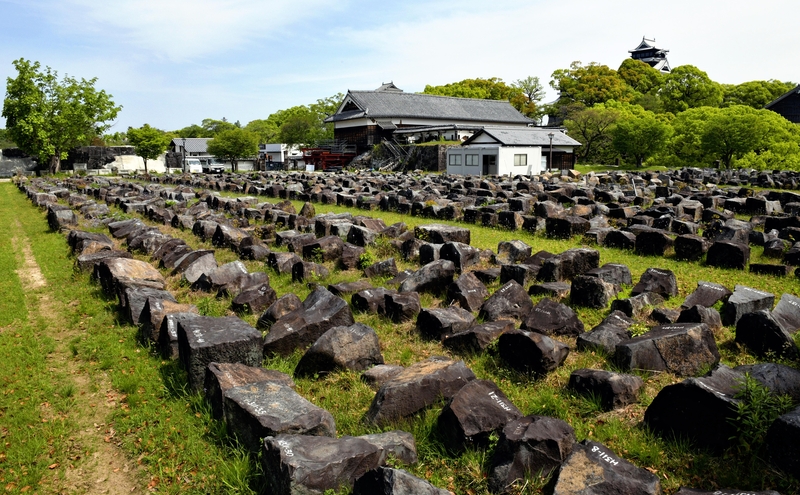 In the section known as Bugyomaru located southwest of the castle, large stones from collapsed portions of the castle walls are lined up in rows. The larger ones are more than a meter across. About 7,500 of these stone were collected from various places on the castle grounds after the quake.