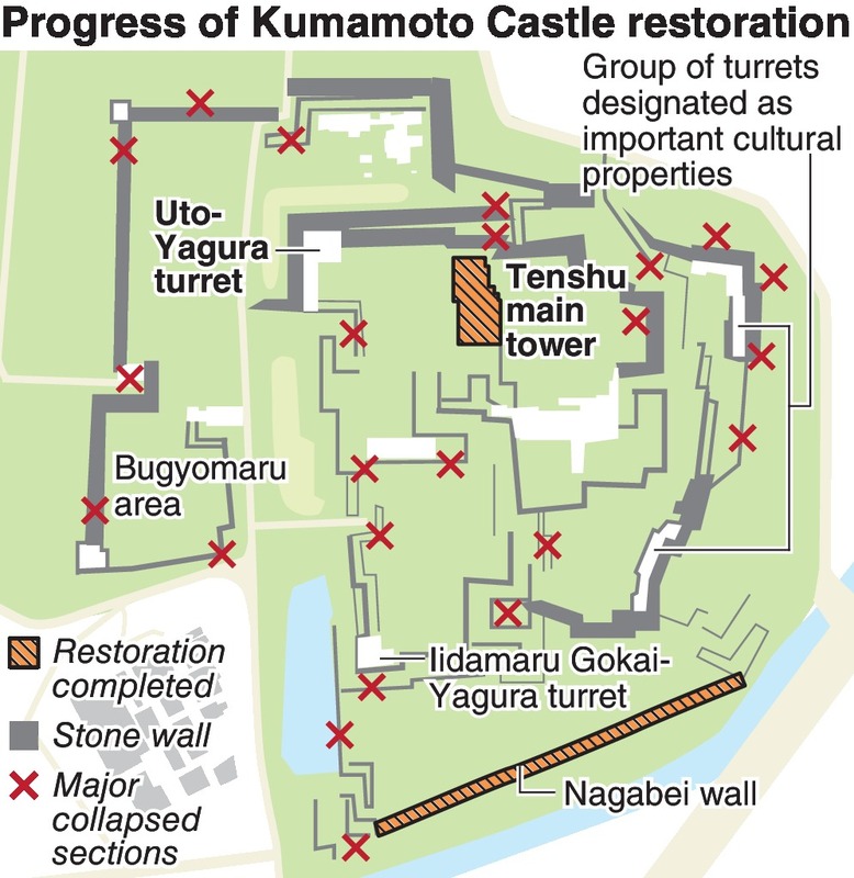 The restoration of all 13 structures designated as important cultural properties and damaged in the quakes, including two destroyed turrets in the northeast corner, is premised on the work first being completed on the stone walls.