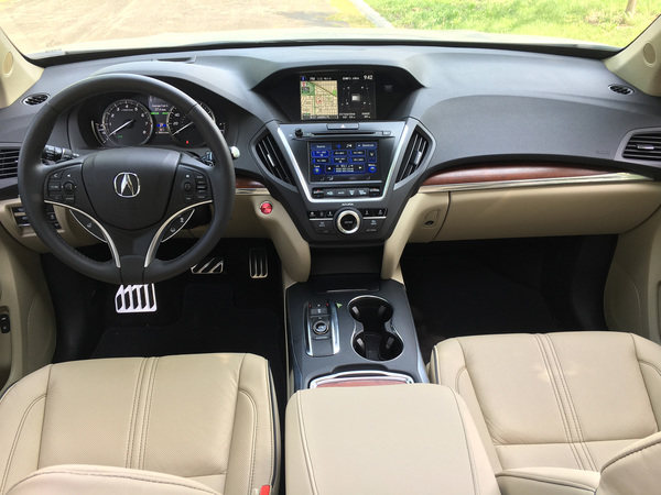 Inside, the MDX Sport Hybrid has exclusive trim in the two highest package options. The tester had the most expensive Advance package, with wood accents between the soft black dash and the lower cream-colored parts that match the leather seats. The Advance package includes a six-seat configuration with the midrow captain's chairs separated by a storage console with cup holder. Buttons and levers make getting and out of the rear seats easy, but this is no place for teens or adults.
