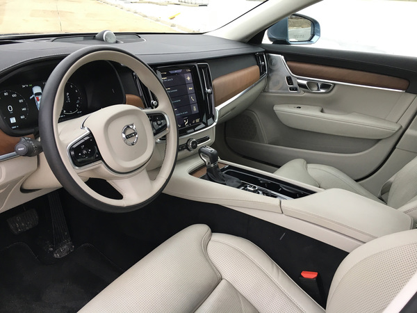 While the S90 is not as large as other flagships, the cabin doesn't feel much smaller. The sleek, spartan design opens up the inside, a feeling enhanced by the tester's cream-colored nappa leather seats, contrasting with the walnut wood trim on the doors, dash and console.