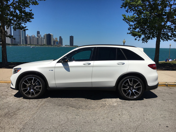 For looks, the AMG diamond-pocked grille appears a little taller, or at least more aggressive, and the side air intakes are a tad wider. There's more chrome lining to make the menacing face wink at vehicles about to be passed. The tester came with 21-inch five-spoke wheels ($1,000 extra) to buff the profile. It looks dignified yet approachable in the Mercedes way, stands out more than Audi's Q5 or BMW's X3 or X5, and is as well-proportioned as the Porsche Macan, though the latter strikes a more aggressive pose.