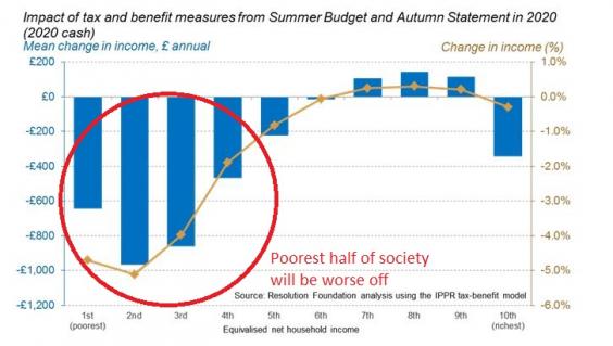 The poor is going to bear the brunt of these changes. The Institute for Fiscal Studies said that 2.6 million working class families will be £1,600 poorer a year because of Osborne's policies: