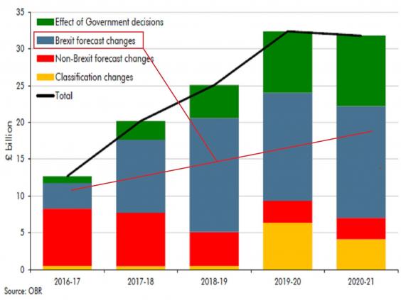 This shows that £58bn of that £122bn deterioration is due, according to the OBR's estimates, directly to the adverse economic impact of Brexit.