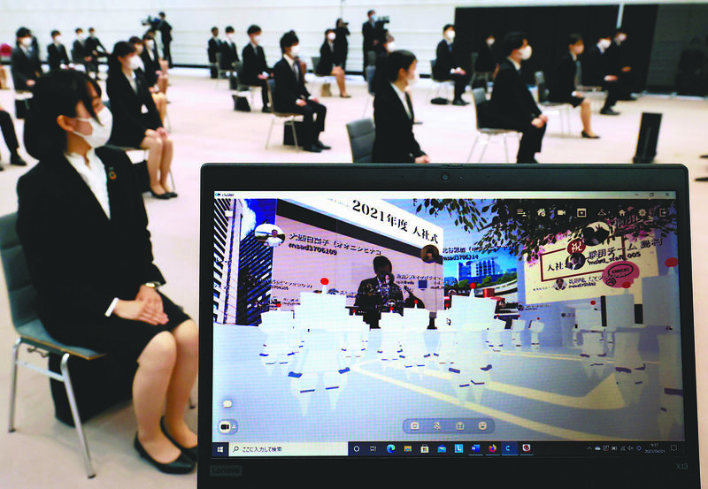 Mitsui Sumitomo Insurance Co., which canceled its welcome ceremony for new employees last year due to the COVID-19 pandemic, held a ceremony Thursday at the company's headquarters in Chiyoda Ward, Tokyo. Of the 272 new employees, 48 who reside in Tokyo attended in person, while the remaining 224 participated via virtual reality using avatars. When these avatars were displayed on a screen in the ceremony venue, they were greeted with applause.