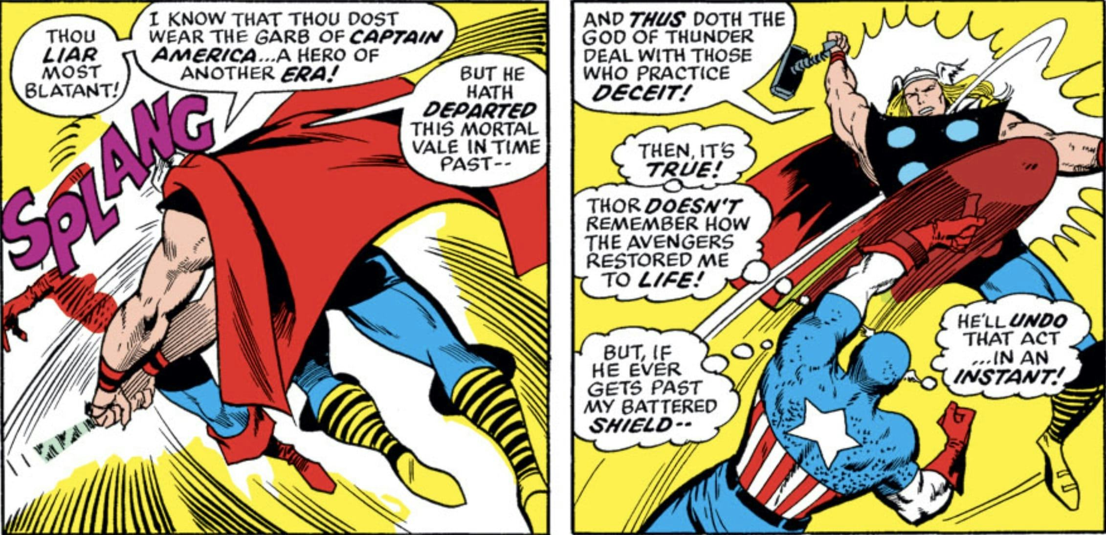 The Scarlet Centurion created an alternate version of the Avengers by traveling back in time to when they were just starting out. By doing this, he created an alternate reality, then using a mind ray to control these Avengers variants into believing all superpowered beings other than themselves needed to be killed, which pitted them against the “Sacred Timeline” Avengers.