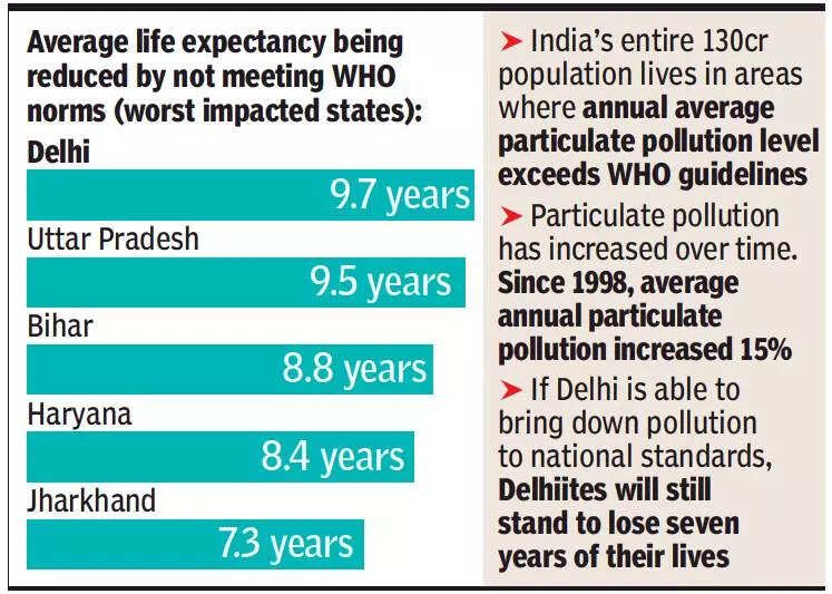 It finds people in north India are still the most hit by air pollution, with 510 million losing an average of 8.5 years of their life if 2019 pollution levels persisted. In terms of states, Delhi is still the most impacted, with the average person losing 9.7 years of life as compared to average life expectancyif WHO standards were being met, with UP in second (9.5 years).