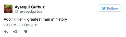 Tweets on her profile - which has since been deleted - from between 2011 and 2014 praise Hitler as the “greatest man in history”and saying "the Jews are so powerful in the US it's disgusting".