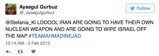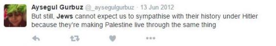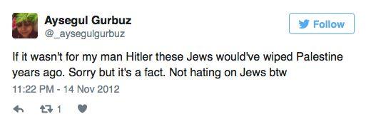 CAAS spokesman Jonathan Sacerdoti said: “Our investigations team found these antisemitic tweets on Aysegul Gurbuz’s personal account. Not only do the tweets glorify Hitler, they also express hope that Iran will wipe out another six million Jews in Israel with a nuclear weapon.