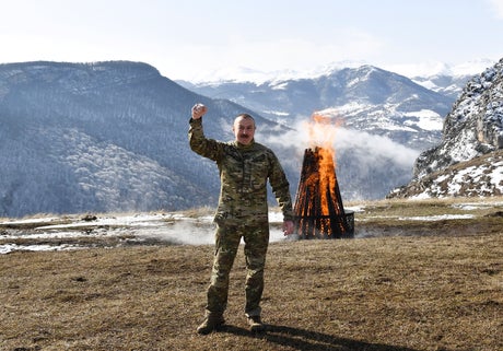 Azerbaijani President Ilham Aliyev marked the Nowruz holiday Saturday by lighting a ceremonial fire outside Shusha, a culturally revered city that Azerbaijan took from Armenian forces in last autumn’s war.
