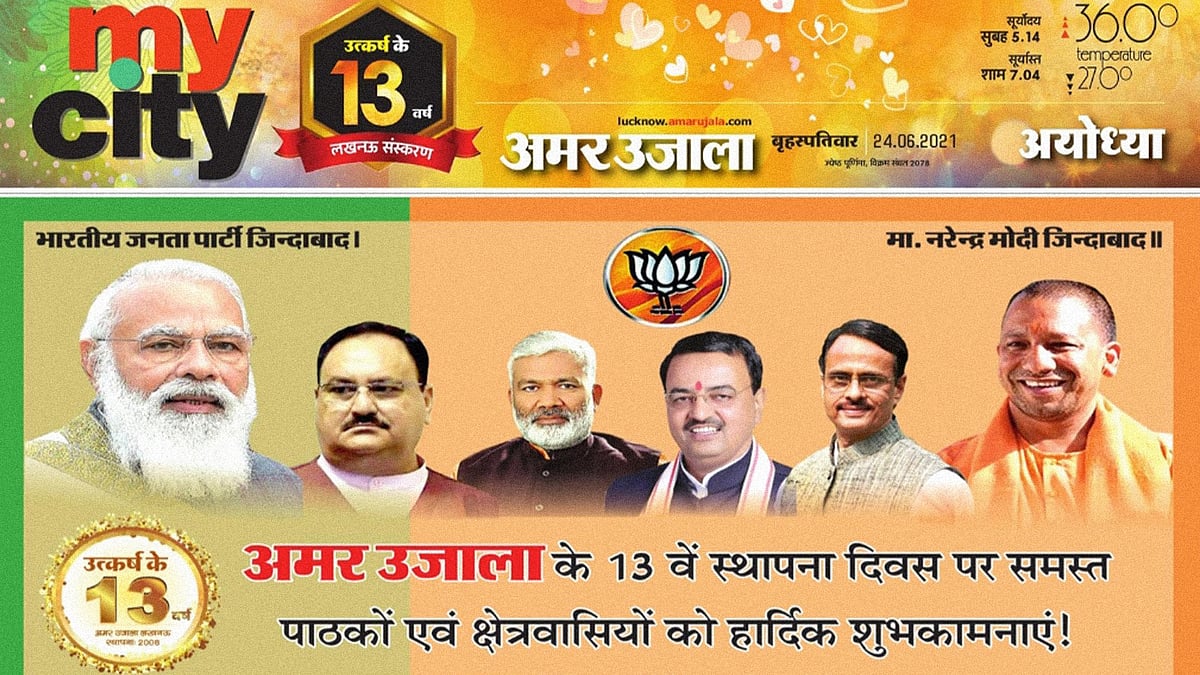24 जून को हिंदी अख़बार अमर उजाला के अयोध्या संस्करण में रुदौली से भारतीय जनता पार्टी (बीजेपी) के विधायक रामचंद्र यादव का पहले पेज पर विज्ञापन छपा. पूरे पेज पर छपे इस विज्ञापन में प्रधानमंत्री नरेंद्र मोदी, उत्तर प्रदेश के मुख्यमंत्री योगी आदित्यनाथ, बीजेपी के राष्ट्रीय और प्रदेश अध्यक्ष, प्रदेश के दोनों उपमुख्यमंत्रियों की तस्वीरों के नीचे लिखा है, ‘‘अमर उजाला के 13 वें स्थापना दिवस पर समस्त पाठकों और क्षेत्रवासियों को हार्दिक शुभकामनाएं.’’